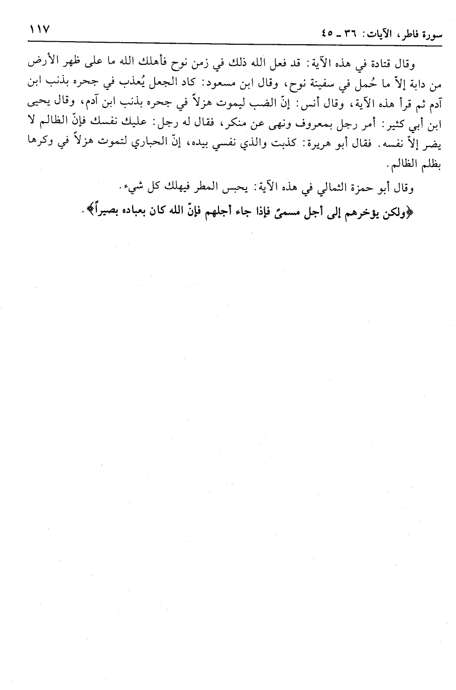 وقال قتادة في هذه الآية: قد فعل الله ذلك في زمن نوح فأهلك الله ما على ظهر الأرض من دابة إلّا ما حمل في سفينة نوح، وقال ابن مسعود: كاد الجعل يعذب في جحره بذنب ابن آدم ثم قرأ هذه الآية، وقال أنس: إنّ الضب ليموت هزلا في جحره بذنب ابن آدم، وقال يحيى ابن أبي كثير: أمر رجل بمعروف ونهى عن منكر، فقال له رجل: عليك نفسك فإنّ الظالم لا يضر إلّا نفسه. فقال أبو هريرة: كذبت والذي نفسي بيده، إنّ الحباري لتموت هزلا في وكرها بظلم الظالم.