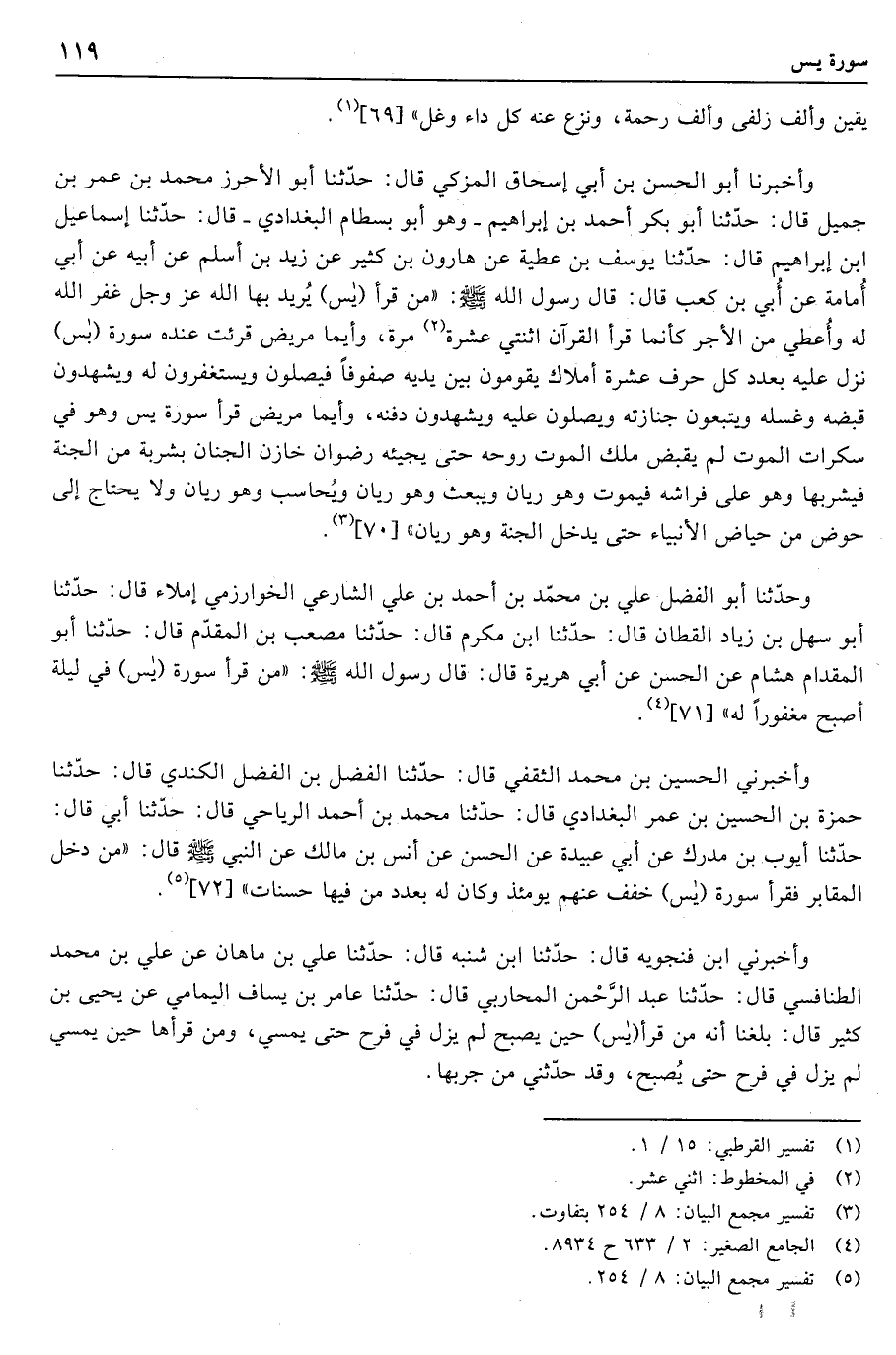 وحدّثنا أبو الفضل علي بن محمّد بن أحمد بن علي الشارعي الخوارزمي إملاء قال: حدّثنا أبو سهل بن زياد القطان قال: حدّثنا ابن مكرم قال: حدّثنا مصعب بن المقدّم قال: حدّثنا أبو المقدام هشام عن الحسن عن أبي هريرة قال: قال رسول الله صلّى الله عليه وسلم: «من قرأ سورة (يس) في ليلة أصبح مغفورا له» [71] «4» .
