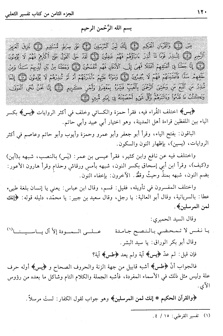 يس (1) وَالْقُرْآنِ الْحَكِيمِ (2) إِنَّكَ لَمِنَ الْمُرْسَلِينَ (3) عَلى صِراطٍ مُسْتَقِيمٍ (4)