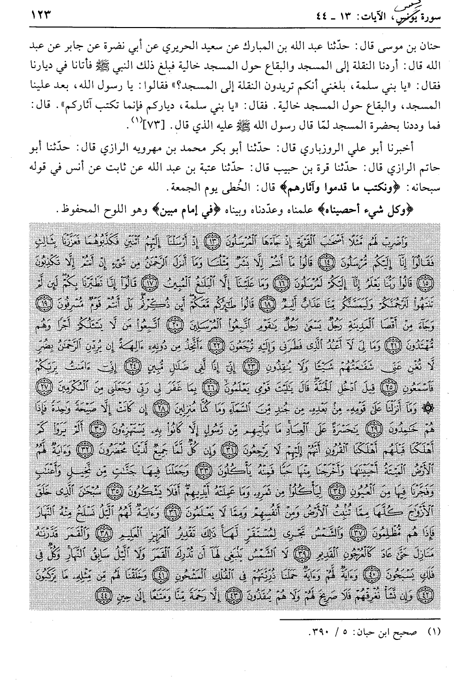 حنان بن موسى قال: حدّثنا عبد الله بن المبارك عن سعيد الحريري عن أبي نضرة عن جابر عن عبد الله قال: أردنا النقلة إلى المسجد والبقاع حول المسجد خالية فبلغ ذلك النبي صلّى الله عليه وسلم فأتانا في ديارنا فقال: «يا بني سلمة، بلغني أنكم تريدون النقلة إلى المسجد؟» فقالوا: يا رسول الله، بعد علينا المسجد، والبقاع حول المسجد خالية. فقال: «يا بني سلمة، دياركم فإنما تكتب آثاركم» . قال: