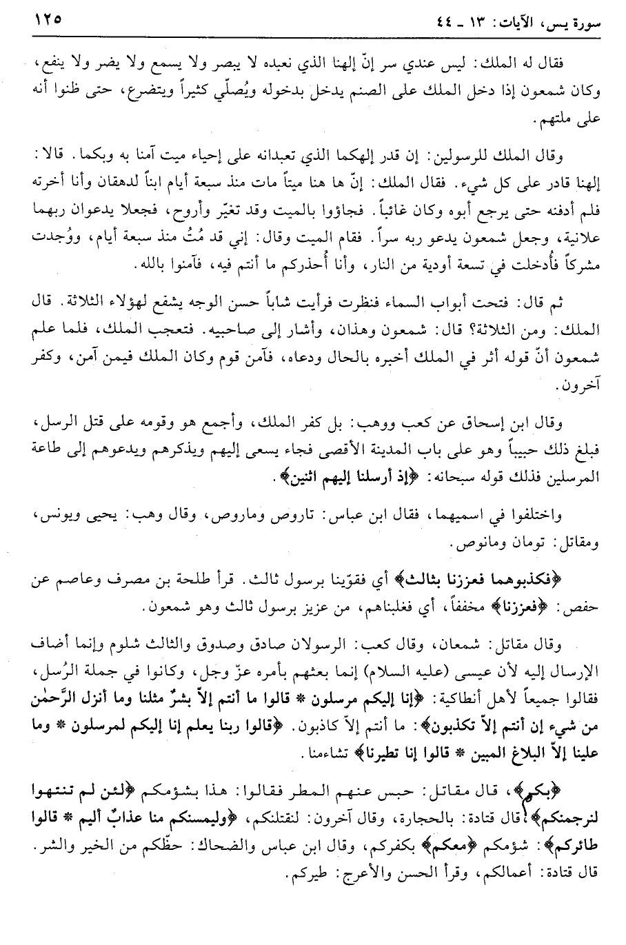 ثم قال: فتحت أبواب السماء فنظرت فرأيت شابا حسن الوجه يشفع لهؤلاء الثلاثة. قال الملك: ومن الثلاثة؟ قال: شمعون وهذان، وأشار إلى صاحبيه. فتعجب الملك، فلما علم شمعون أنّ قوله أثر في الملك أخبره بالحال ودعاه، فآمن قوم وكان الملك فيمن آمن، وكفر آخرون.