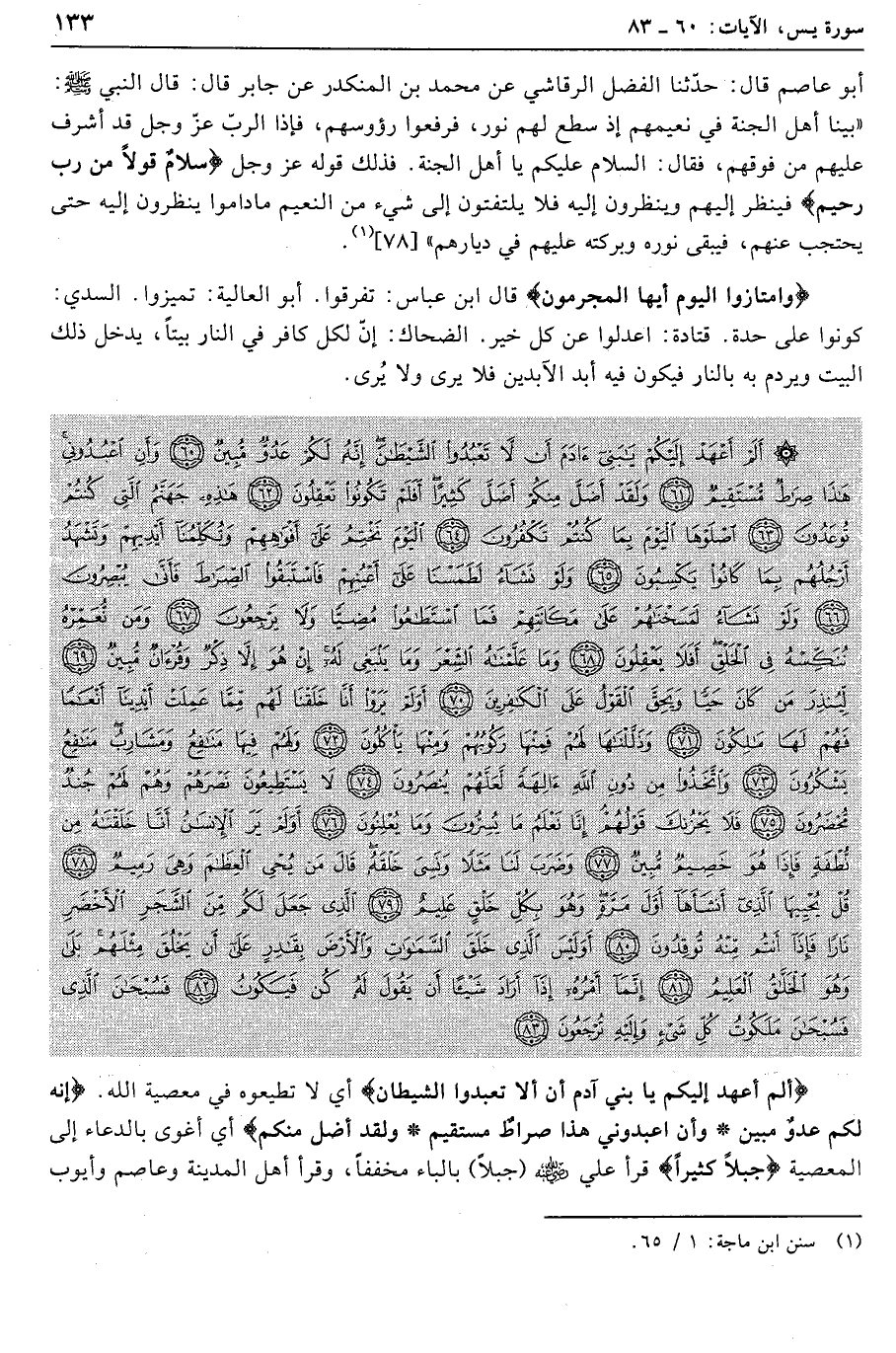 أَلَمْ أَعْهَدْ إِلَيْكُمْ يا بَنِي آدَمَ أَنْ لا تَعْبُدُوا الشَّيْطانَ إِنَّهُ لَكُمْ عَدُوٌّ مُبِينٌ (60) وَأَنِ اعْبُدُونِي هذا صِراطٌ مُسْتَقِيمٌ (61) وَلَقَدْ أَضَلَّ مِنْكُمْ جِبِلاًّ كَثِيراً أَفَلَمْ تَكُونُوا تَعْقِلُونَ (62) هذِهِ جَهَنَّمُ الَّتِي كُنْتُمْ تُوعَدُونَ (63) اصْلَوْهَا الْيَوْمَ بِما كُنْتُمْ تَكْفُرُونَ (64)