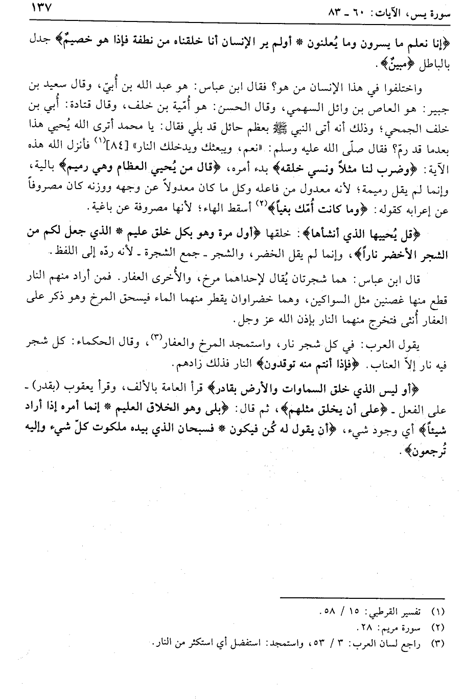 أَوَلَيْسَ الَّذِي خَلَقَ السَّماواتِ وَالْأَرْضَ بِقادِرٍ قرأ العامة بالألف، وقرأ يعقوب (بقدر) - على الفعل- عَلى أَنْ يَخْلُقَ مِثْلَهُمْ، ثم قال: بَلى وَهُوَ الْخَلَّاقُ الْعَلِيمُ. إِنَّما أَمْرُهُ إِذا أَرادَ شَيْئاً أي وجود شيء، أَنْ يَقُولَ لَهُ كُنْ فَيَكُونُ. فَسُبْحانَ الَّذِي بِيَدِهِ مَلَكُوتُ كُلِّ شَيْءٍ وَإِلَيْهِ تُرْجَعُونَ.