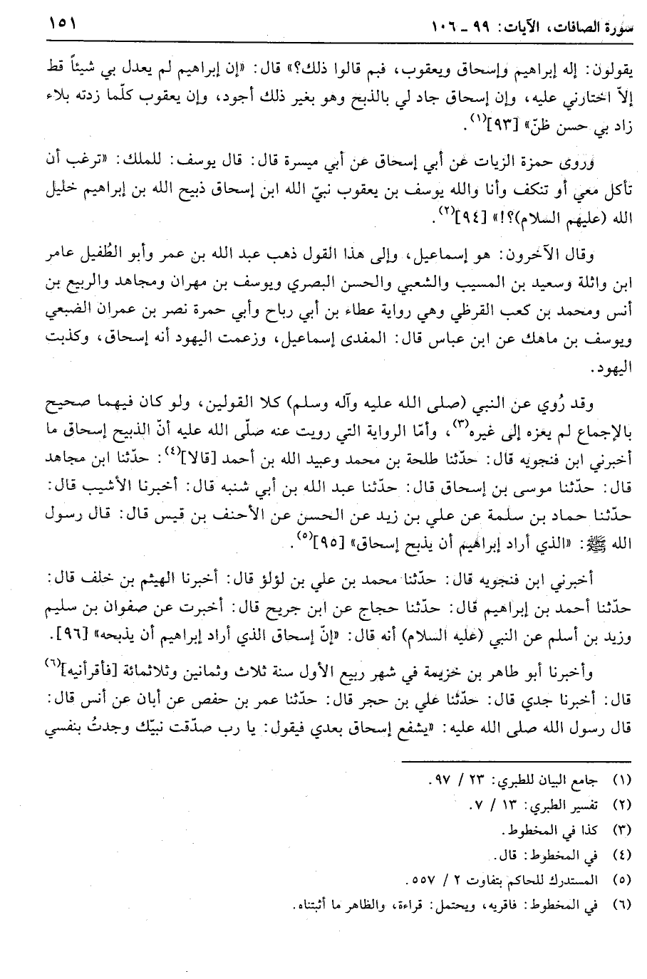 حدّثنا أحمد بن إبراهيم قال: حدّثنا حجاج عن ابن جريح قال: أخبرت عن صفوان بن سليم وزيد بن أسلم عن النبي (عليه السلام) أنه قال: «إنّ إسحاق الذي أراد إبراهيم أن يذبحه» [96] .