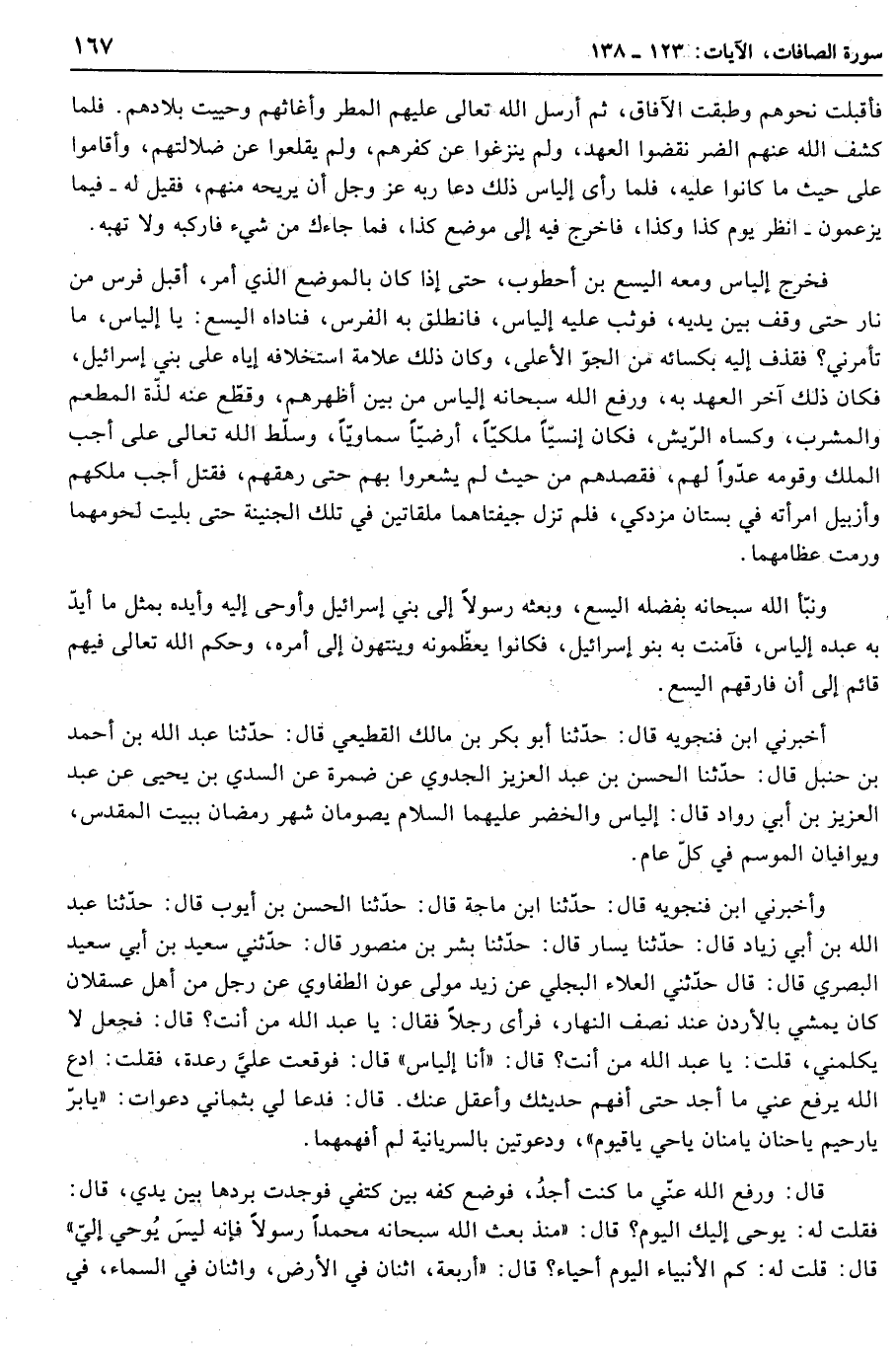 وأخبرني ابن فنجويه قال: حدّثنا ابن ماجة قال: حدّثنا الحسن بن أيوب قال: حدّثنا عبد الله بن أبي زياد قال: حدّثنا يسار قال: حدّثنا بشر بن منصور قال: حدّثني سعيد بن أبي سعيد البصري قال: قال حدّثني العلاء البجلي عن زيد مولى عون الطفاوي عن رجل من أهل عسقلان كان يمشي بالأردن عند نصف النهار، فرأى رجلا فقال: يا عبد الله من أنت؟ قال: فجعل لا يكلمني، قلت: يا عبد الله من أنت؟ قال: «أنا إلياس» قال: فوقعت عليّ رعدة، فقلت: ادع الله يرفع عني ما أجد حتى أفهم حديثك وأعقل عنك. قال: فدعا لي بثماني دعوات: «يا برّ يا رحيم يا حنان يا منان يا حي يا قيوم» ، ودعوتين بالسريانية لم أفهمهما.