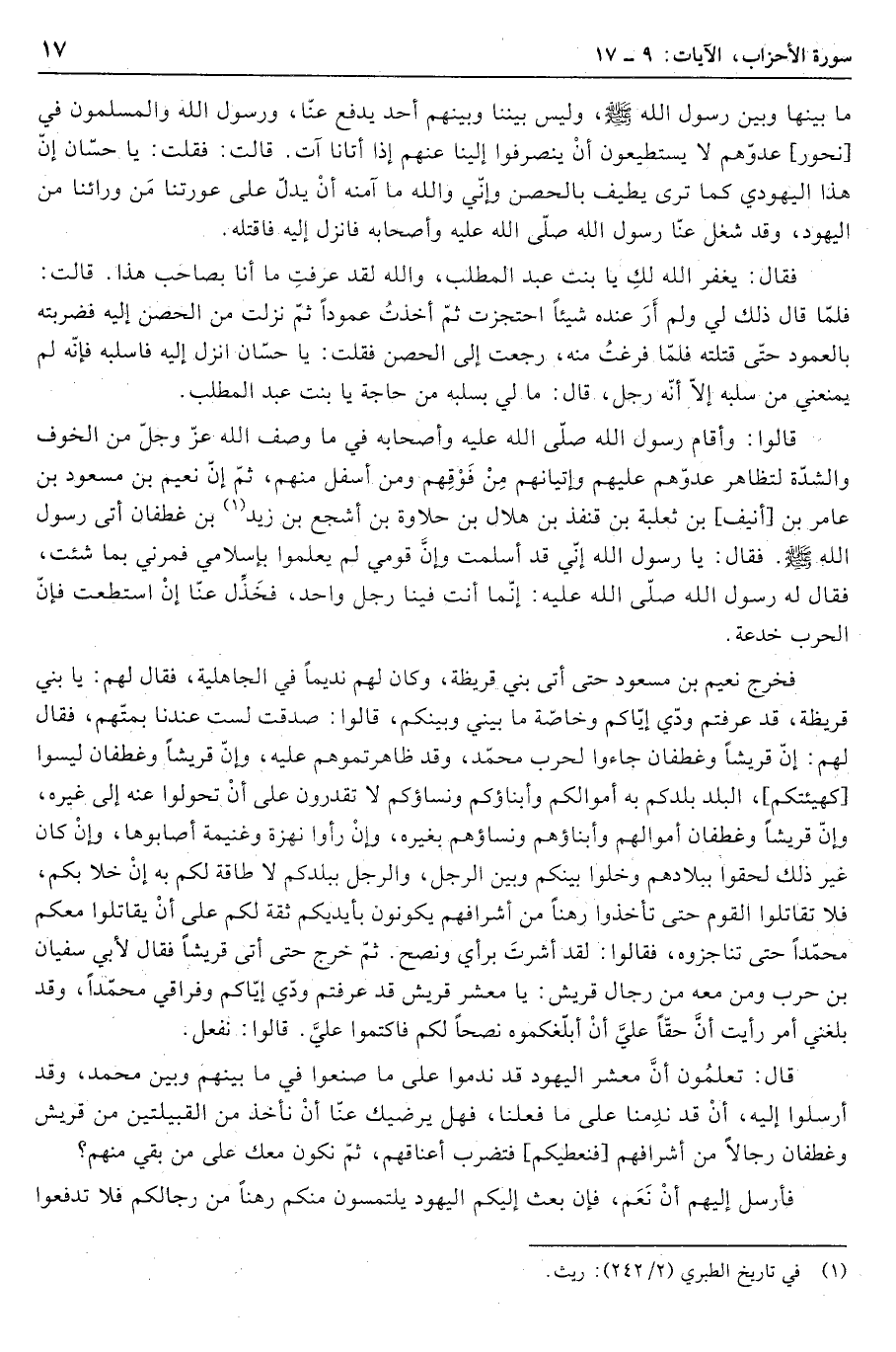 فخرج نعيم بن مسعود حتى أتى بني قريظة، وكان لهم نديما في الجاهلية، فقال لهم: يا بني قريظة، قد عرفتم ودّي إيّاكم وخاصّة ما بيني وبينكم، قالوا: صدقت لست عندنا بمتّهم، فقال لهم: إنّ قريشا وغطفان جاءوا لحرب محمّد، وقد ظاهرتموهم عليه، وإنّ قريشا وغطفان ليسوا [كهيئتكم] ، البلد بلدكم به أموالكم وأبناؤكم ونساؤكم لا تقدرون على أن تحولوا عنه إلى غيره، وإنّ قريشا وغطفان أموالهم وأبناؤهم ونساؤهم بغيره، وإن رأوا نهزة وغنيمة أصابوها، وإن كان غير ذلك لحقوا ببلادهم وخلوا بينكم وبين الرجل، والرجل ببلدكم لا طاقة لكم به إن خلا بكم، فلا تقاتلوا القوم حتى تأخذوا رهنا من أشرافهم يكونون بأيديكم ثقة لكم على أن يقاتلوا معكم محمّدا حتى تناجزوه، فقالوا: لقد أشرت برأي ونصح. ثمّ خرج حتى أتى قريشا فقال لأبي سفيان بن حرب ومن معه من رجال قريش: يا معشر قريش قد عرفتم ودّي إيّاكم وفراقي محمّدا، وقد بلغني أمر رأيت أنّ حقّا عليّ أن أبلّغكموه نصحا لكم فاكتموا عليّ. قالوا: نفعل.