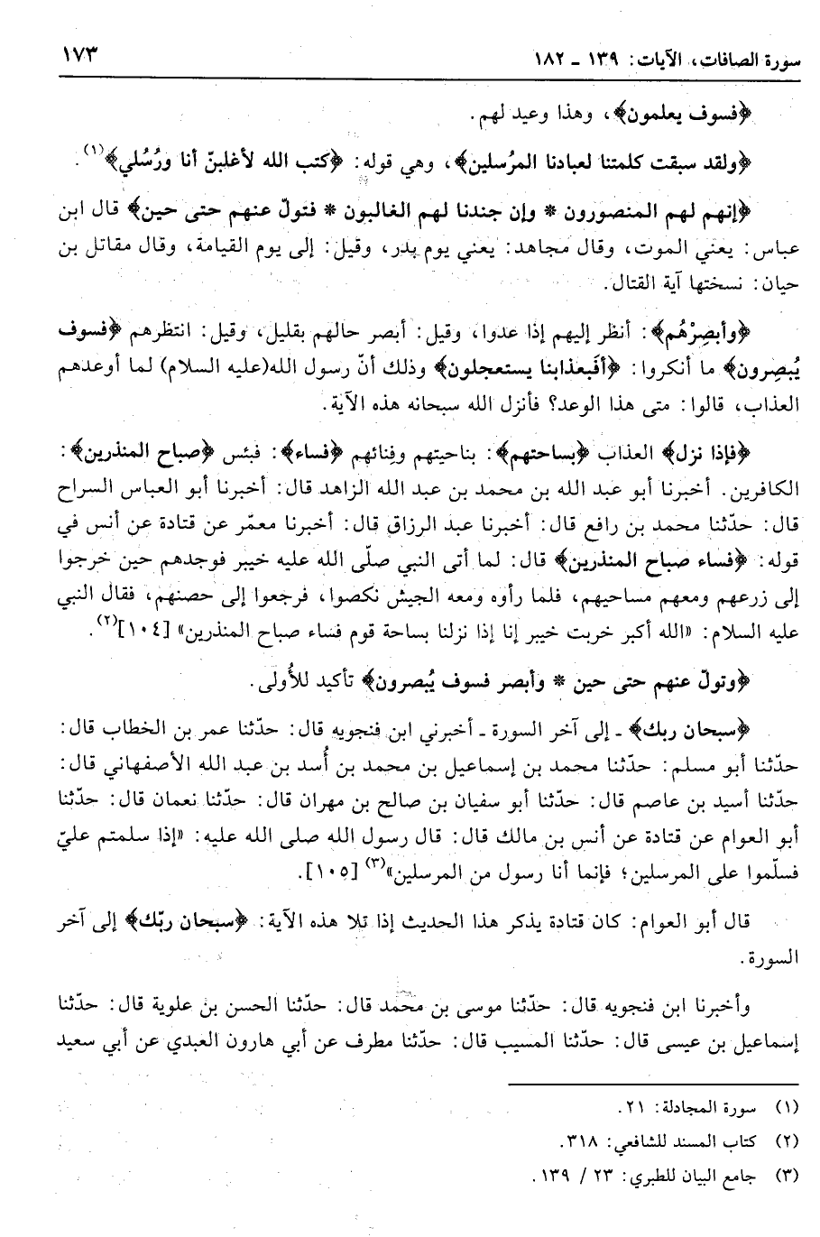 أخبرنا أبو عبد الله بن محمد بن عبد الله الزاهد قال: أخبرنا أبو العباس السراح قال: حدّثنا محمد بن رافع قال: أخبرنا عبد الرزاق قال: أخبرنا معمّر عن قتادة عن أنس في قوله: فَساءَ صَباحُ الْمُنْذَرِينَ قال: لما أتى النبي صلّى الله عليه خيبر فوجدهم حين خرجوا إلى زرعهم ومعهم مساحيهم، فلما رأوه ومعه الجيش نكصوا، فرجعوا إلى حصنهم، فقال النبي عليه السلام: «الله أكبر خربت خيبر إنا إذا نزلنا بساحة قوم فَساءَ صَباحُ الْمُنْذَرِينَ» [104] «2» .