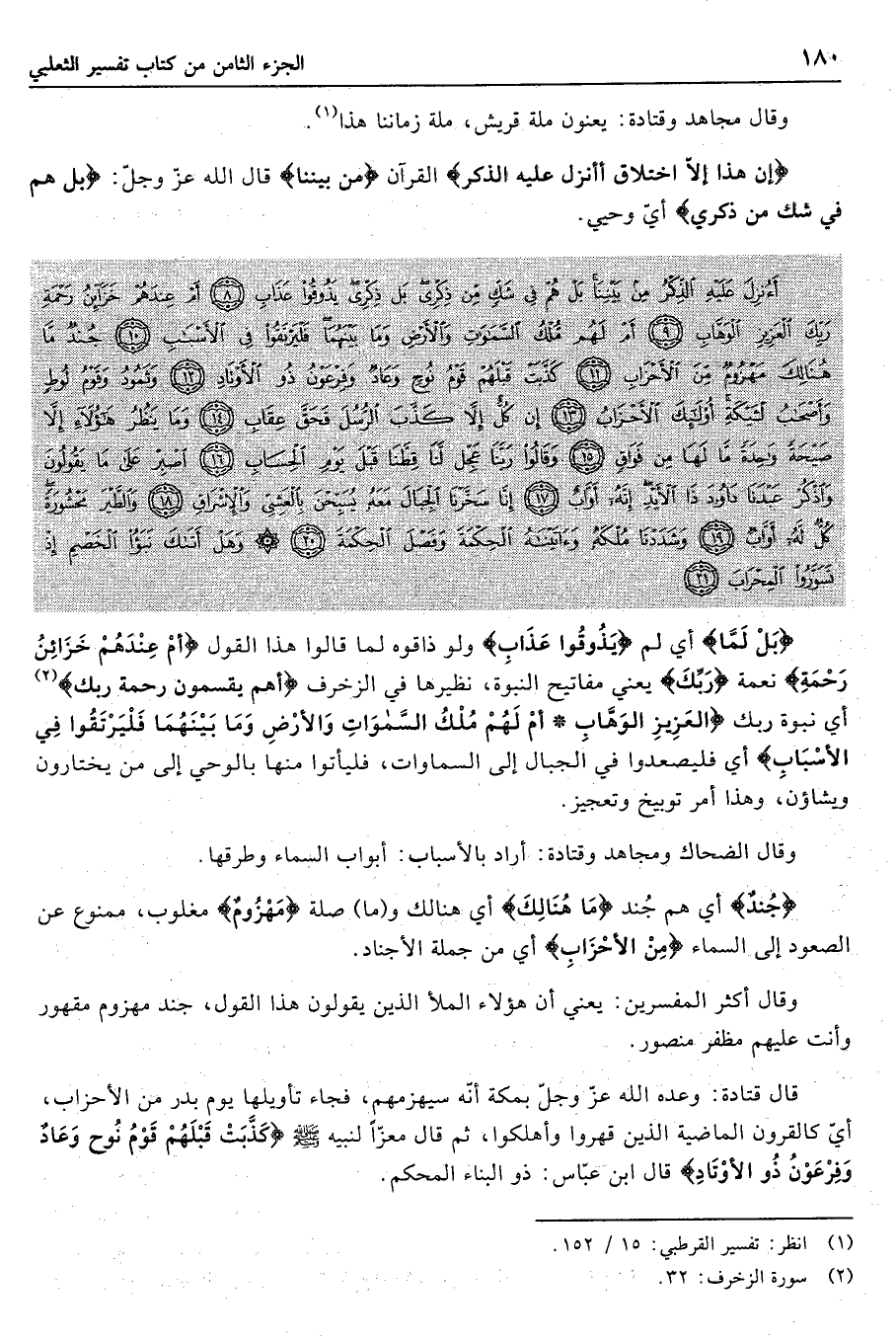 أَأُنْزِلَ عَلَيْهِ الذِّكْرُ مِنْ بَيْنِنا بَلْ هُمْ فِي شَكٍّ مِنْ ذِكْرِي بَلْ لَمَّا يَذُوقُوا عَذابِ (8) أَمْ عِنْدَهُمْ خَزائِنُ رَحْمَةِ رَبِّكَ الْعَزِيزِ الْوَهَّابِ (9) أَمْ لَهُمْ مُلْكُ السَّماواتِ وَالْأَرْضِ وَما بَيْنَهُما فَلْيَرْتَقُوا فِي الْأَسْبابِ (10) جُنْدٌ ما هُنالِكَ مَهْزُومٌ مِنَ الْأَحْزابِ (11) كَذَّبَتْ قَبْلَهُمْ قَوْمُ نُوحٍ وَعادٌ وَفِرْعَوْنُ ذُو الْأَوْتادِ (12)
