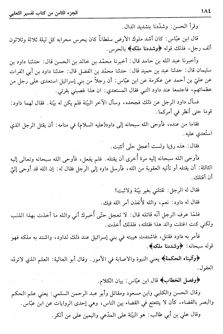 قال ابن عبّاس: كان أشد ملوك الأرض سلطانا كان يحرس محرابه كل ليلة ثلاثة وثلاثون ألف رجل، فذلك قوله وَشَدَدْنا مُلْكَهُ بالحرس.
