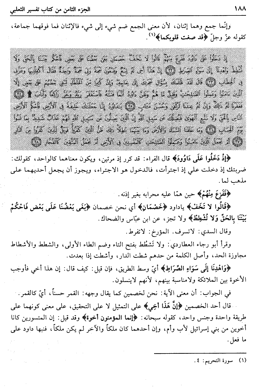 إِذْ دَخَلُوا عَلى داوُدَ فَفَزِعَ مِنْهُمْ قالُوا لا تَخَفْ خَصْمانِ بَغى بَعْضُنا عَلى بَعْضٍ فَاحْكُمْ بَيْنَنا بِالْحَقِّ وَلا تُشْطِطْ وَاهْدِنا إِلى سَواءِ الصِّراطِ (22) إِنَّ هذا أَخِي لَهُ تِسْعٌ وَتِسْعُونَ نَعْجَةً وَلِيَ نَعْجَةٌ واحِدَةٌ فَقالَ أَكْفِلْنِيها وَعَزَّنِي فِي الْخِطابِ (23) قالَ لَقَدْ ظَلَمَكَ بِسُؤالِ نَعْجَتِكَ إِلى نِعاجِهِ وَإِنَّ كَثِيراً مِنَ الْخُلَطاءِ لَيَبْغِي بَعْضُهُمْ عَلى بَعْضٍ إِلاَّ الَّذِينَ آمَنُوا وَعَمِلُوا الصَّالِحاتِ وَقَلِيلٌ ما هُمْ وَظَنَّ داوُدُ أَنَّما فَتَنَّاهُ فَاسْتَغْفَرَ رَبَّهُ وَخَرَّ راكِعاً وَأَنابَ (24) فَغَفَرْنا لَهُ ذلِكَ وَإِنَّ لَهُ عِنْدَنا لَزُلْفى وَحُسْنَ مَآبٍ (25) يا داوُدُ إِنَّا جَعَلْناكَ خَلِيفَةً فِي الْأَرْضِ فَاحْكُمْ بَيْنَ النَّاسِ بِالْحَقِّ وَلا تَتَّبِعِ الْهَوى فَيُضِلَّكَ عَنْ سَبِيلِ اللَّهِ إِنَّ الَّذِينَ يَضِلُّونَ عَنْ سَبِيلِ اللَّهِ لَهُمْ عَذابٌ شَدِيدٌ بِما نَسُوا يَوْمَ الْحِسابِ (26)