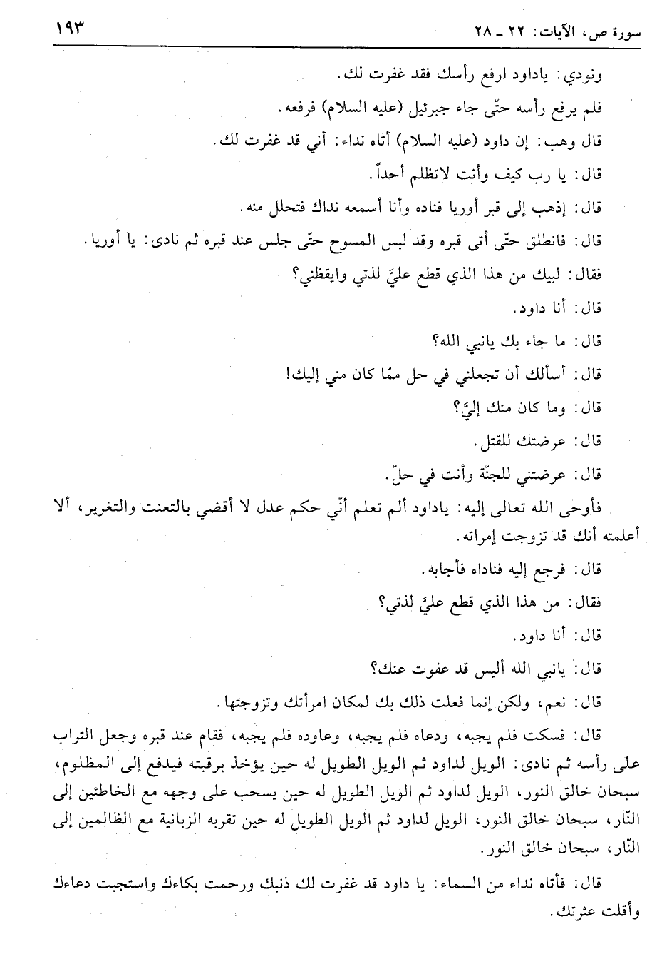 قال: فسكت فلم يجبه، ودعاه فلم يجبه، وعاوده فلم يجبه، فقام عند قبره وجعل التراب على رأسه ثم نادى: الويل لداود ثم الويل الطويل له حين يؤخذ برقبته فيدفع إلى المظلوم، سبحان خالق النور، الويل لداود ثم الويل الطويل له حين يسحب على وجهه مع الخاطئين إلى النّار، سبحان خالق النور، الويل لداود ثم الويل الطويل له حين تقربه الزبانية مع الظالمين إلى النّار، سبحان خالق النور.