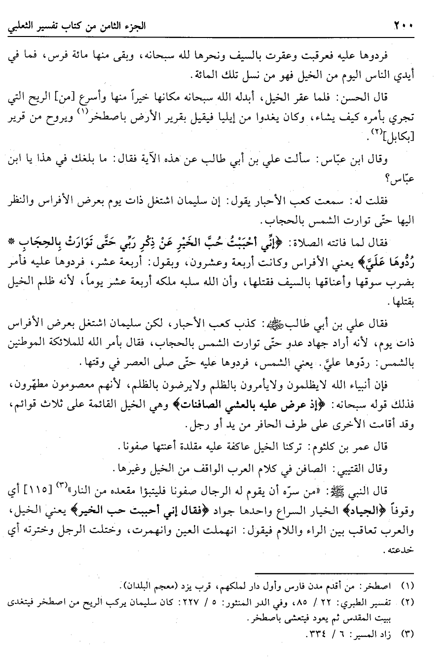 فقلت له: سمعت كعب الأحبار يقول: إن سليمان اشتغل ذات يوم بعرض الأفراس والنظر إليها حَتَّى تَوارَتْ الشمس بِالْحِجابِ.