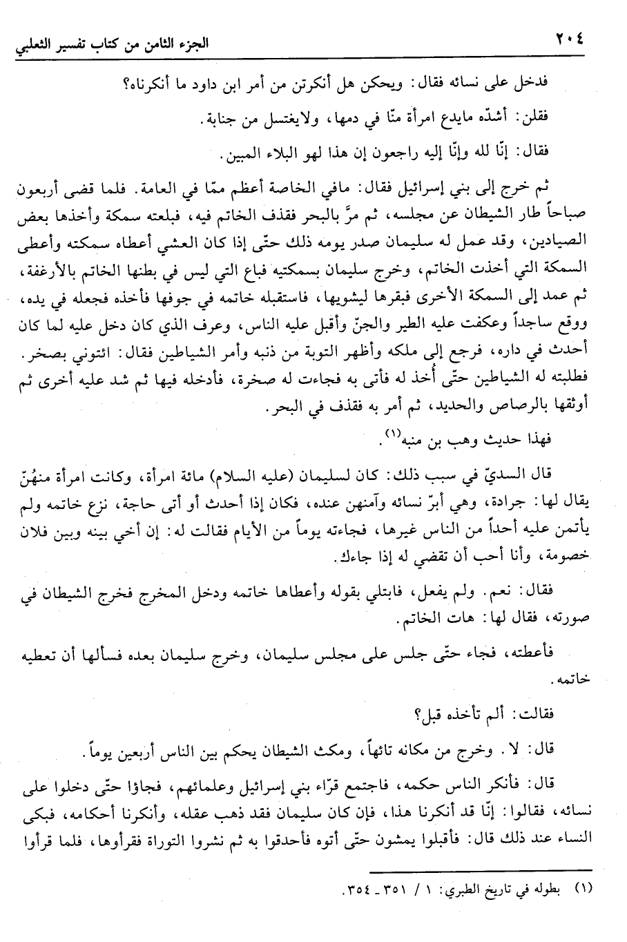 ثم خرج إلى بني إسرائيل فقال: ما في الخاصة أعظم ممّا في العامة. فلما قضى أربعون صباحا طار الشيطان عن مجلسه، ثم مرّ بالبحر فقذف الخاتم فيه، فبلعته سمكة وأخذها بعض الصيادين، وقد عمل له سليمان صدر يومه ذلك حتّى إذا كان العشي أعطاه سمكته وأعطى السمكة التي أخذت الخاتم، وخرج سليمان بسمكتيه فباع التي ليس في بطنها الخاتم بالأرغفة، ثم عمد إلى السمكة الأخرى فبقرها ليشويها، فاستقبله خاتمه في جوفها فأخذه فجعله في يده، ووقع ساجدا وعكفت عليه الطير والجنّ وأقبل عليه الناس، وعرف الذي كان دخل عليه لما كان أحدث في داره، فرجع إلى ملكه وأظهر التوبة من ذنبه وأمر الشياطين فقال: ائتوني بصخر.