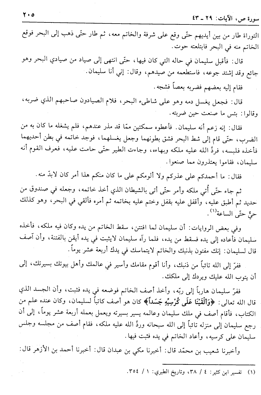 ففرّ سليمان هاربا إلى ربّه، وأخذ أصف الخاتم فوضعه في يده فثبت، وأن الجسد الذي قال الله تعالى: وَأَلْقَيْنا عَلى كُرْسِيِّهِ جَسَداً كان هو أصف كاتبا لسليمان، وكان عنده علم من الكتاب، فأقام أصف في ملك سليمان وعالمه يسير بسيرته ويعمل بعمله أربعة عشر يوما، إلى أن رجع سليمان إلى منزله تائبا إلى الله سبحانه وردّ الله عليه ملكه، فقام أصف من مجلسه وجلس سليمان على كرسيه، وأعاد الخاتم في يده فثبت فيها.