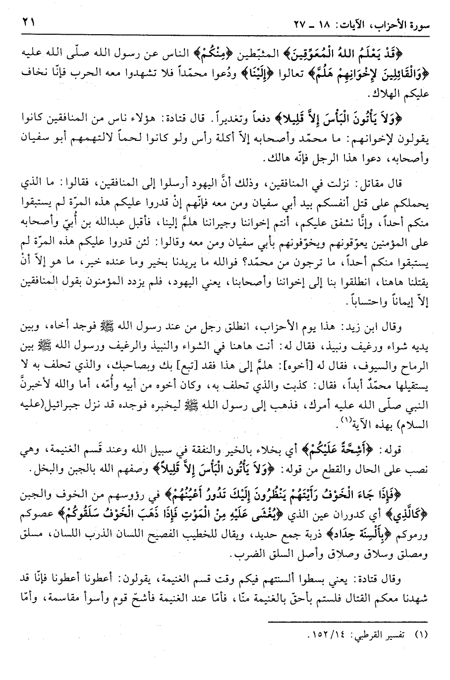 وقال ابن زيد: هذا يوم الأحزاب، انطلق رجل من عند رسول الله صلّى الله عليه وسلم فوجد أخاه، وبين يديه شواء ورغيف ونبيذ، فقال له: أنت هاهنا في الشواء والنبيذ والرغيف ورسول الله صلّى الله عليه وسلم بين الرماح والسيوف، فقال له [أخوه] : هلمّ إلى هذا فقد [تبع] بك وبصاحبك، والذي تحلف به لا يستقيلها محمّد أبدا، فقال: كذبت والذي تحلف به، وكان أخوه من أبيه وأمّه، أما والله لأخبرنّ النبي صلّى الله عليه أمرك، فذهب إلى رسول الله صلّى الله عليه وسلم ليخبره فوجده قد نزل جبرائيل (عليه السلام) بهذه الآية «1» .