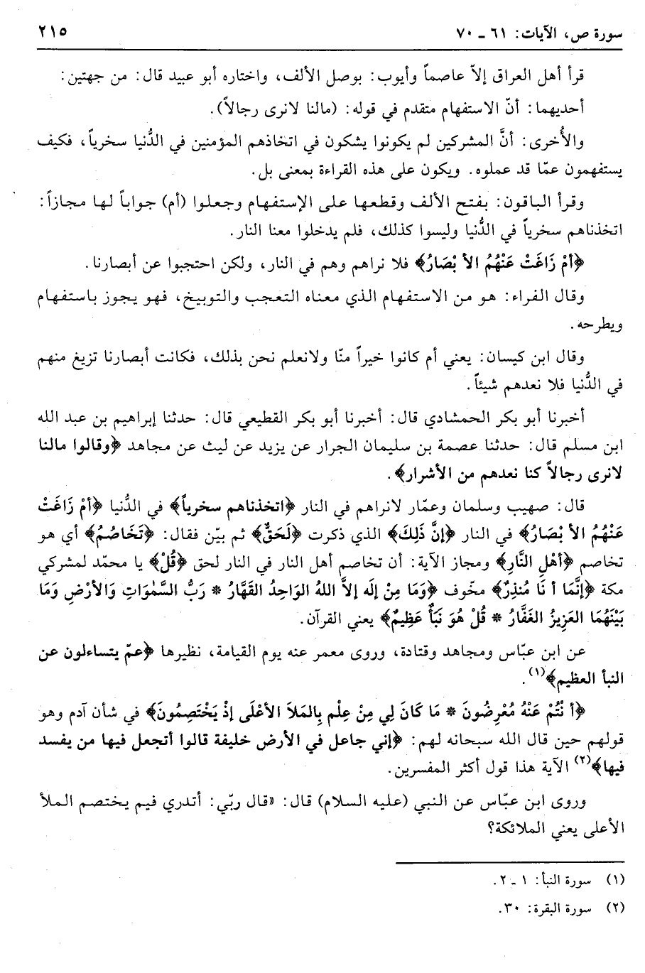 قال: صهيب وسلمان وعمّار لا نراهم في النار أَتَّخَذْناهُمْ سِخْرِيًّا في الدّنيا أَمْ زاغَتْ عَنْهُمُ الْأَبْصارُ في النار إِنَّ ذلِكَ الذي ذكرت لَحَقٌّ ثم بيّن فقال: تَخاصُمُ أي هو تخاصم أَهْلِ النَّارِ ومجاز الآية: أن تخاصم أهل النار في النار لحق قُلْ يا محمّد لمشركي مكة إِنَّما أَنَا مُنْذِرٌ مخّوف وَما مِنْ إِلهٍ إِلَّا اللَّهُ الْواحِدُ الْقَهَّارُ رَبُّ السَّماواتِ وَالْأَرْضِ وَما بَيْنَهُمَا الْعَزِيزُ الْغَفَّارُ قُلْ هُوَ نَبَأٌ عَظِيمٌ يعني القرآن.