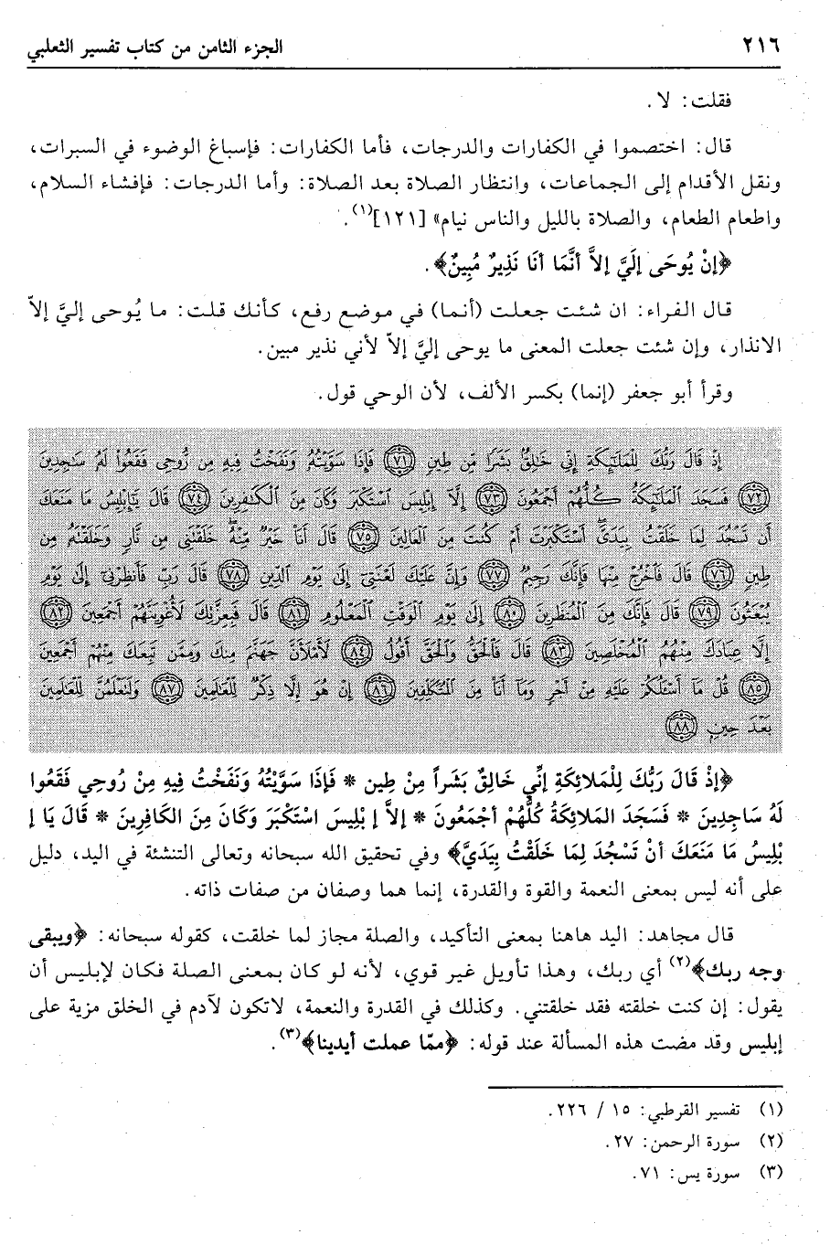 إِذْ قالَ رَبُّكَ لِلْمَلائِكَةِ إِنِّي خالِقٌ بَشَراً مِنْ طِينٍ (71) فَإِذا سَوَّيْتُهُ وَنَفَخْتُ فِيهِ مِنْ رُوحِي فَقَعُوا لَهُ ساجِدِينَ (72) فَسَجَدَ الْمَلائِكَةُ كُلُّهُمْ أَجْمَعُونَ (73) إِلاَّ إِبْلِيسَ اسْتَكْبَرَ وَكانَ مِنَ الْكافِرِينَ (74) قالَ يا إِبْلِيسُ ما مَنَعَكَ أَنْ تَسْجُدَ لِما خَلَقْتُ بِيَدَيَّ أَسْتَكْبَرْتَ أَمْ كُنْتَ مِنَ الْعالِينَ (75)