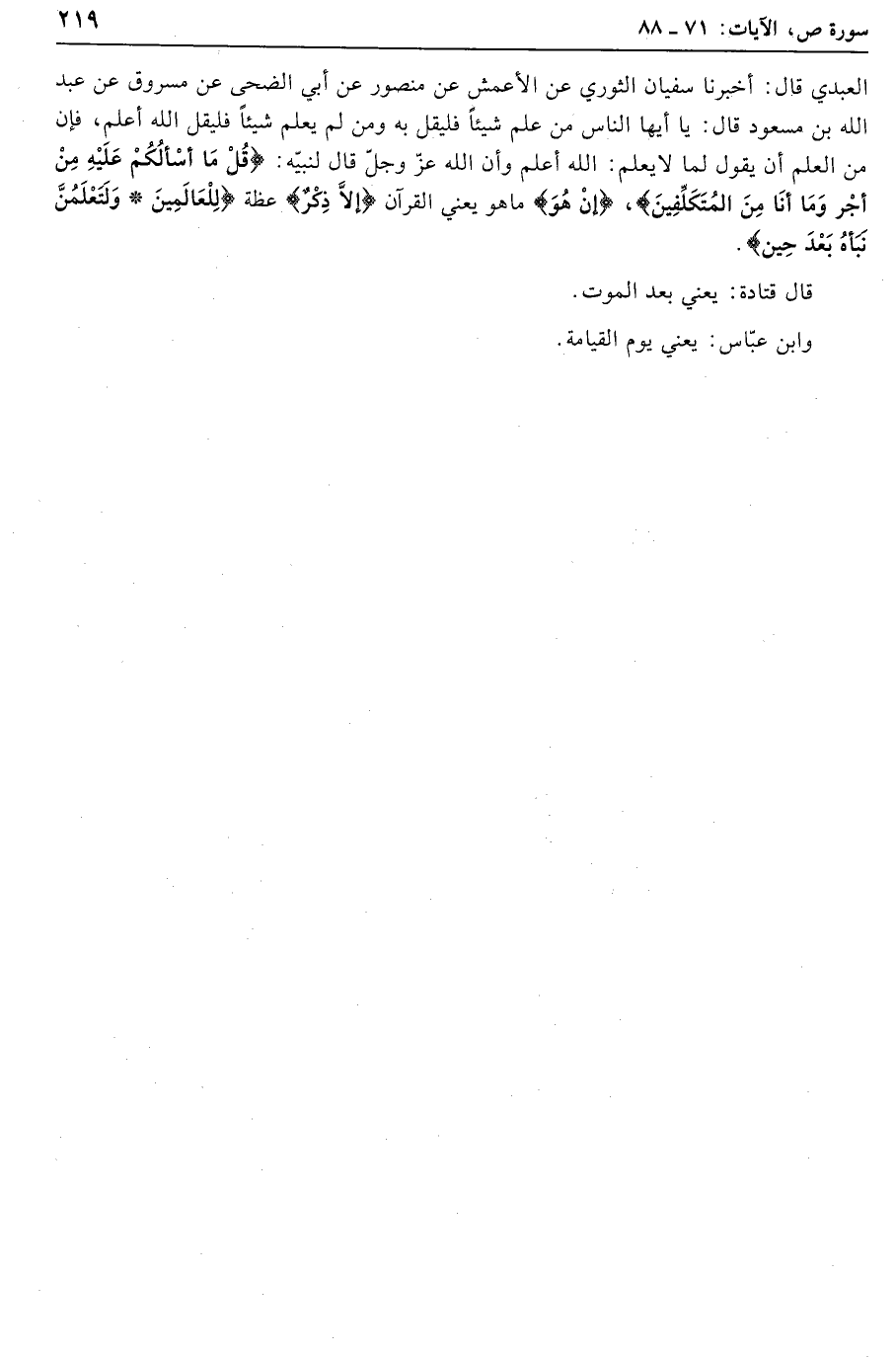 العبدي قال: أخبرنا سفيان الثوري عن الأعمش عن منصور عن أبي الضحى عن مسروق عن عبد الله بن مسعود قال: يا أيها الناس من علم شيئا فليقل به ومن لم يعلم شيئا فليقل الله أعلم، فإن من العلم أن يقول لما لا يعلم: الله أعلم وأن الله عزّ وجلّ قال لنبيّه: قُلْ ما أَسْئَلُكُمْ عَلَيْهِ مِنْ أَجْرٍ وَما أَنَا مِنَ الْمُتَكَلِّفِينَ، إِنْ هُوَ ما هو يعني القرآن إِلَّا ذِكْرٌ عظة لِلْعالَمِينَ وَلَتَعْلَمُنَّ نَبَأَهُ بَعْدَ حِينٍ.