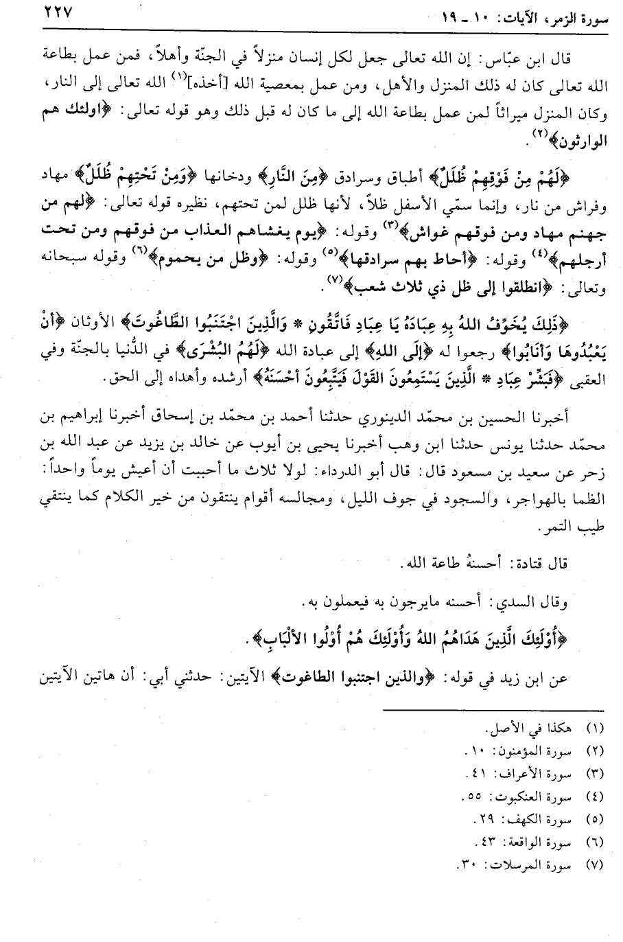 ذلِكَ يُخَوِّفُ اللَّهُ بِهِ عِبادَهُ يا عِبادِ فَاتَّقُونِ وَالَّذِينَ اجْتَنَبُوا الطَّاغُوتَ الأوثان أَنْ يَعْبُدُوها وَأَنابُوا رجعوا له إِلَى اللَّهِ إلى عبادة الله لَهُمُ الْبُشْرى في الدّنيا بالجنّة وفي العقبى فَبَشِّرْ عِبادِ الَّذِينَ يَسْتَمِعُونَ الْقَوْلَ فَيَتَّبِعُونَ أَحْسَنَهُ أرشده وأهداه إلى الحق.