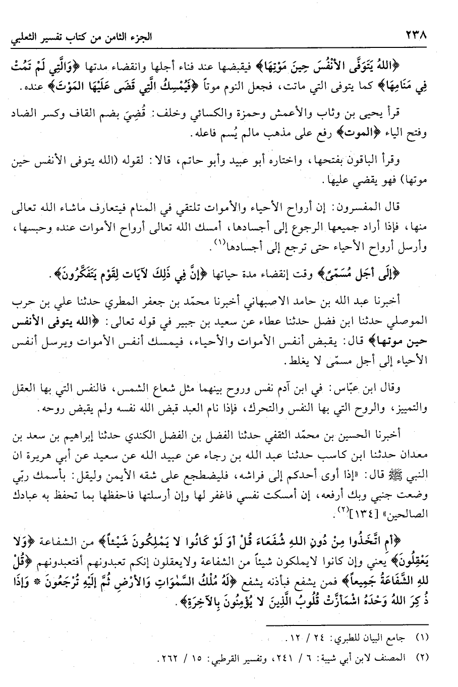أخبرنا عبد الله بن حامد الأصبهاني أخبرنا محمّد بن جعفر المطري حدثنا علي بن حرب الموصلي حدثنا ابن فضل حدثنا عطاء عن سعيد بن جبير في قوله تعالى: اللَّهُ يَتَوَفَّى الْأَنْفُسَ حِينَ مَوْتِها قال: يقبض أنفس الأموات والأحياء، فيمسك أنفس الأموات ويرسل أنفس الأحياء إلى أجل مسمّى لا يغلط.