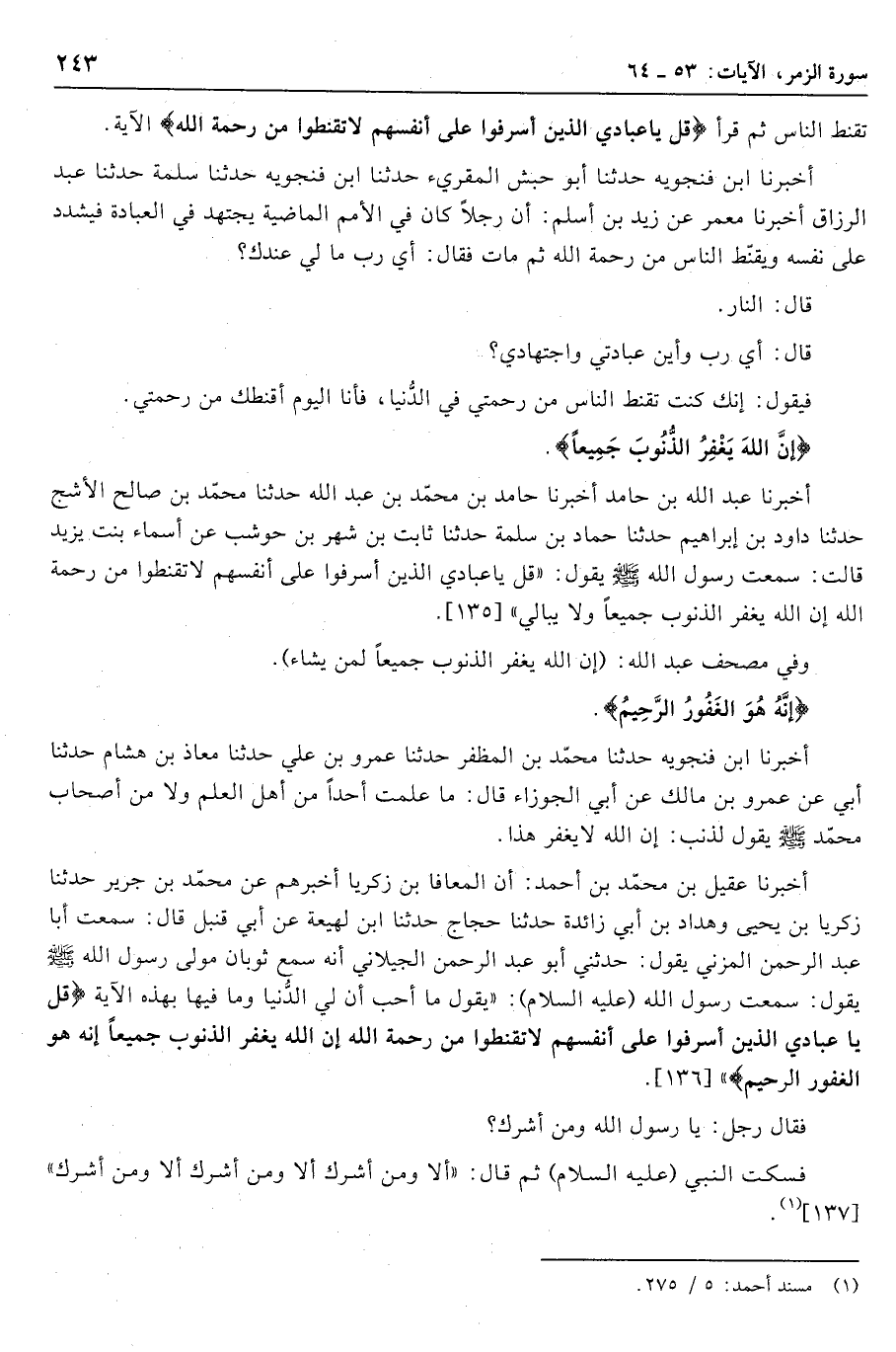 أخبرنا عبد الله بن حامد أخبرنا حامد بن محمّد بن عبد الله حدثنا محمّد بن صالح الأشج حدثنا داود بن إبراهيم حدثنا حماد بن سلمة حدثنا ثابت بن شهر بن حوشب عن أسماء بنت يزيد قالت: سمعت رسول الله صلى الله عليه وسلم يقول: «قُلْ يا عِبادِيَ الَّذِينَ أَسْرَفُوا عَلى أَنْفُسِهِمْ لا تَقْنَطُوا مِنْ رَحْمَةِ اللَّهِ إِنَّ اللَّهَ يَغْفِرُ الذُّنُوبَ جَمِيعاً ولا يبالي» [135] .