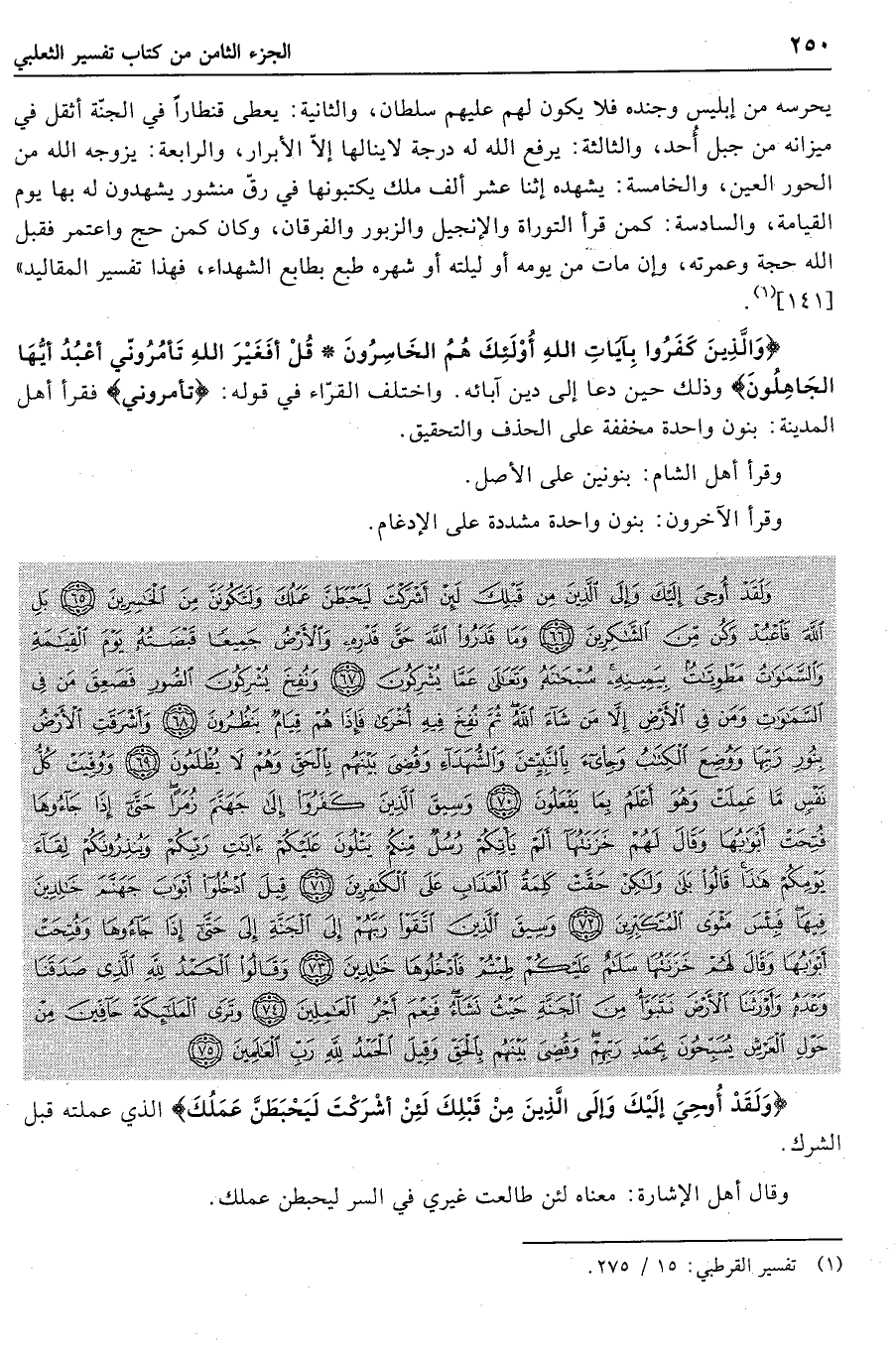 وَالَّذِينَ كَفَرُوا بِآياتِ اللَّهِ أُولئِكَ هُمُ الْخاسِرُونَ قُلْ أَفَغَيْرَ اللَّهِ تَأْمُرُونِّي أَعْبُدُ أَيُّهَا الْجاهِلُونَ وذلك حين دعا إلى دين آبائه. واختلف القرّاء في قوله: تَأْمُرُونِّي فقرأ أهل المدينة: بنون واحدة مخففة على الحذف والتحقيق.