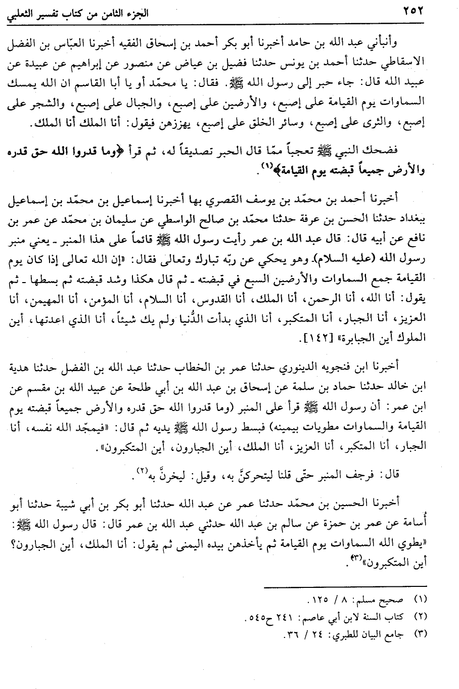 أخبرنا ابن فنجويه الدينوري حدثنا عمر بن الخطاب حدثنا عبد الله بن الفضل حدثنا هدية ابن خالد حدثنا حماد بن سلمة عن إسحاق بن عبد الله بن أبي طلحة عن عبيد الله بن مقسم عن ابن عمر: أن رسول الله صلّى الله عليه وسلم قرأ على المنبر (وَما قَدَرُوا اللَّهَ حَقَّ قَدْرِهِ وَالْأَرْضُ جَمِيعاً قَبْضَتُهُ يَوْمَ الْقِيامَةِ وَالسَّماواتُ مَطْوِيَّاتٌ بِيَمِينِهِ) فبسط رسول الله صلّى الله عليه وسلم يديه ثم قال: «فيمجّد الله نفسه، أنا الجبار، أنا المتكبر، أنا العزيز، أنا الملك، أين الجبارون، أين المتكبرون» .