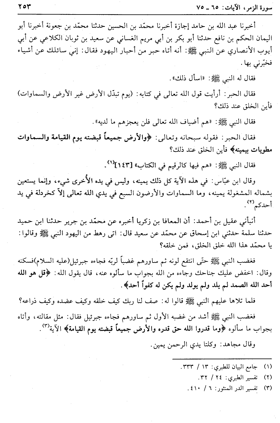 فلما تلاها عليهم النبي صلّى الله عليه وسلم قالوا له: صف لنا ربك كيف خلقه وكيف عضده وكيف ذراعه؟