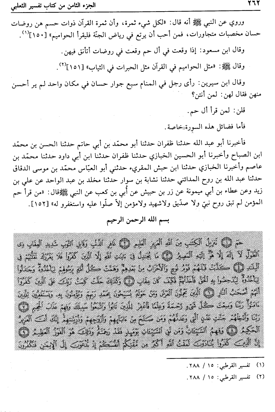 وروي عن النبي صلى الله عليه وسلم أنه قال: «لكل شيء ثمرة، وأن ثمرة القرآن ذوات حسم هن روضات حسان مخصبات متجاورات، فمن أحب أن يرتع في رياض الجنّة فليقرأ الحواميم» [150] «1» .