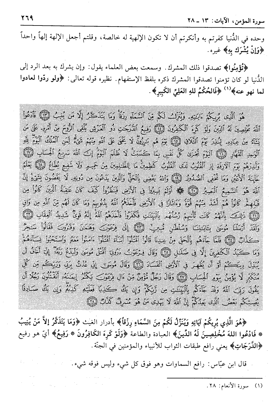 وَقالَ رَجُلٌ مُؤْمِنٌ مِنْ آلِ فِرْعَوْنَ يَكْتُمُ إِيمانَهُ أَتَقْتُلُونَ رَجُلاً أَنْ يَقُولَ رَبِّيَ اللَّهُ وَقَدْ جاءَكُمْ بِالْبَيِّناتِ مِنْ رَبِّكُمْ وَإِنْ يَكُ كاذِباً فَعَلَيْهِ كَذِبُهُ وَإِنْ يَكُ صادِقاً يُصِبْكُمْ بَعْضُ الَّذِي يَعِدُكُمْ إِنَّ اللَّهَ لا يَهْدِي مَنْ هُوَ مُسْرِفٌ كَذَّابٌ (28)