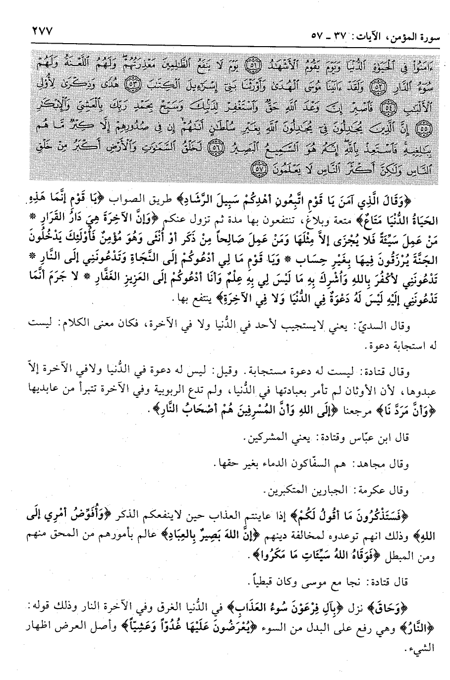 وَلَقَدْ آتَيْنا مُوسَى الْهُدى وَأَوْرَثْنا بَنِي إِسْرائِيلَ الْكِتابَ (53) هُدىً وَذِكْرى لِأُولِي الْأَلْبابِ (54) فَاصْبِرْ إِنَّ وَعْدَ اللَّهِ حَقٌّ وَاسْتَغْفِرْ لِذَنْبِكَ وَسَبِّحْ بِحَمْدِ رَبِّكَ بِالْعَشِيِّ وَالْإِبْكارِ (55) إِنَّ الَّذِينَ يُجادِلُونَ فِي آياتِ اللَّهِ بِغَيْرِ سُلْطانٍ أَتاهُمْ إِنْ فِي صُدُورِهِمْ إِلاَّ كِبْرٌ ما هُمْ بِبالِغِيهِ فَاسْتَعِذْ بِاللَّهِ إِنَّهُ هُوَ السَّمِيعُ الْبَصِيرُ (56) لَخَلْقُ السَّماواتِ وَالْأَرْضِ أَكْبَرُ مِنْ خَلْقِ النَّاسِ وَلكِنَّ أَكْثَرَ النَّاسِ لا يَعْلَمُونَ (57)