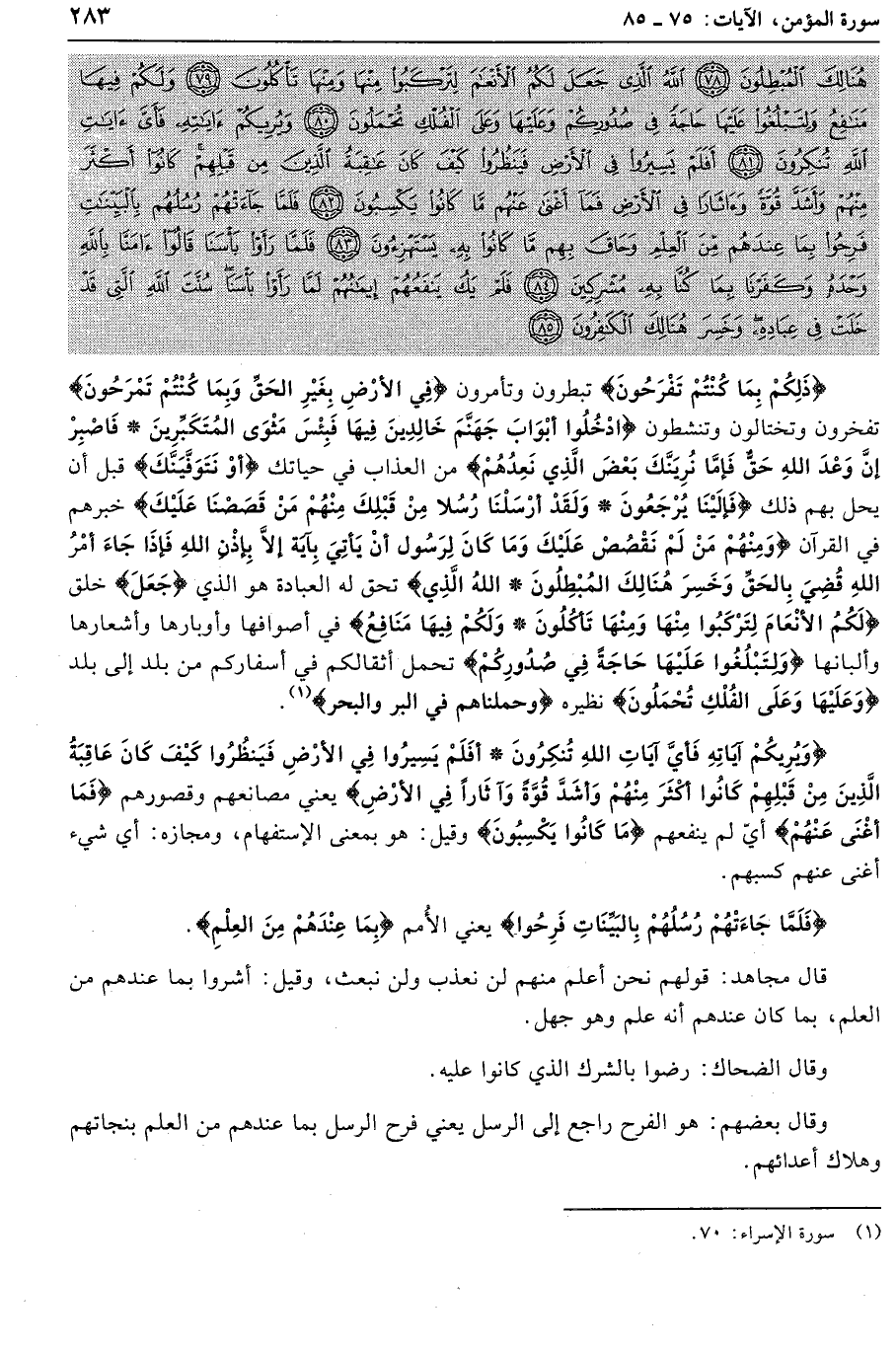 ذلِكُمْ بِما كُنْتُمْ تَفْرَحُونَ فِي الْأَرْضِ بِغَيْرِ الْحَقِّ وَبِما كُنْتُمْ تَمْرَحُونَ (75) ادْخُلُوا أَبْوابَ جَهَنَّمَ خالِدِينَ فِيها فَبِئْسَ مَثْوَى الْمُتَكَبِّرِينَ (76) فَاصْبِرْ إِنَّ وَعْدَ اللَّهِ حَقٌّ فَإِمَّا نُرِيَنَّكَ بَعْضَ الَّذِي نَعِدُهُمْ أَوْ نَتَوَفَّيَنَّكَ فَإِلَيْنا يُرْجَعُونَ (77) وَلَقَدْ أَرْسَلْنا رُسُلاً مِنْ قَبْلِكَ مِنْهُمْ مَنْ قَصَصْنا عَلَيْكَ وَمِنْهُمْ مَنْ لَمْ نَقْصُصْ عَلَيْكَ وَما كانَ لِرَسُولٍ أَنْ يَأْتِيَ بِآيَةٍ إِلاَّ بِإِذْنِ اللَّهِ فَإِذا جاءَ أَمْرُ اللَّهِ قُضِيَ بِالْحَقِّ وَخَسِرَ هُنالِكَ الْمُبْطِلُونَ (78) اللَّهُ الَّذِي جَعَلَ لَكُمُ الْأَنْعامَ لِتَرْكَبُوا مِنْها وَمِنْها تَأْكُلُونَ (79)