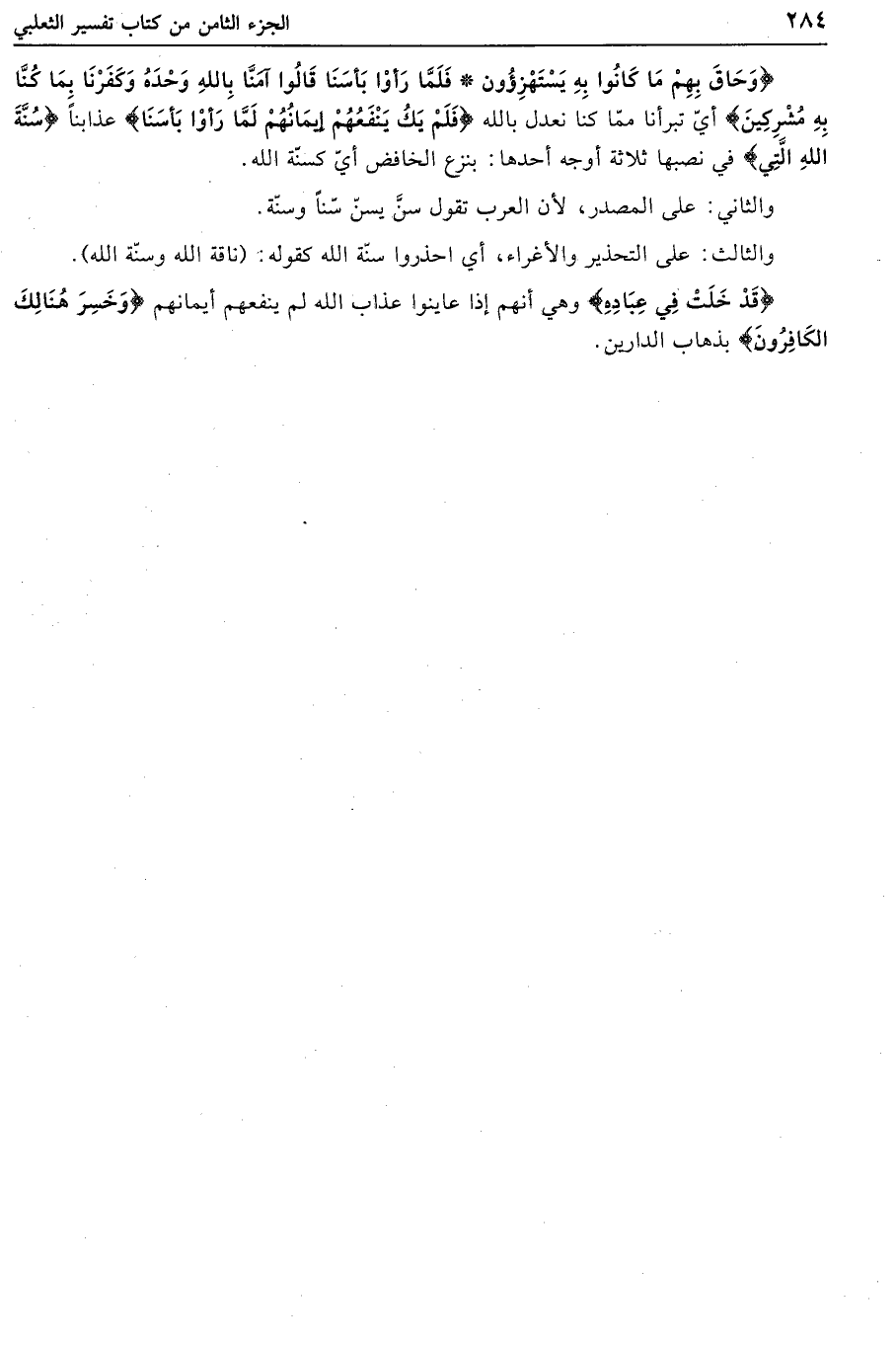 وَحاقَ بِهِمْ ما كانُوا بِهِ يَسْتَهْزِؤُنَ فَلَمَّا رَأَوْا بَأْسَنا قالُوا آمَنَّا بِاللَّهِ وَحْدَهُ وَكَفَرْنا بِما كُنَّا بِهِ مُشْرِكِينَ أيّ تبرأنا ممّا كنا نعدل بالله فَلَمْ يَكُ يَنْفَعُهُمْ إِيمانُهُمْ لَمَّا رَأَوْا بَأْسَنا عذابنا سُنَّةَ اللَّهِ الَّتِي في نصبها ثلاثة أوجه أحدها: بنزع الخافض أيّ كسنّة الله.
