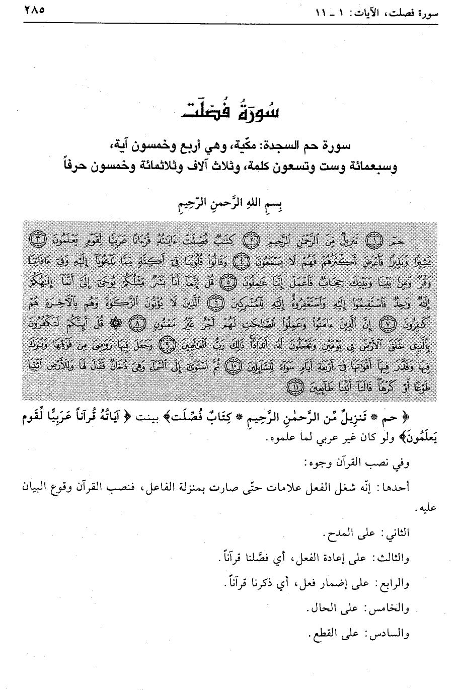 حم (1) تَنْزِيلٌ مِنَ الرَّحْمنِ الرَّحِيمِ (2) كِتابٌ فُصِّلَتْ آياتُهُ قُرْآناً عَرَبِيًّا لِقَوْمٍ يَعْلَمُونَ (3) بَشِيراً وَنَذِيراً فَأَعْرَضَ أَكْثَرُهُمْ فَهُمْ لا يَسْمَعُونَ (4)