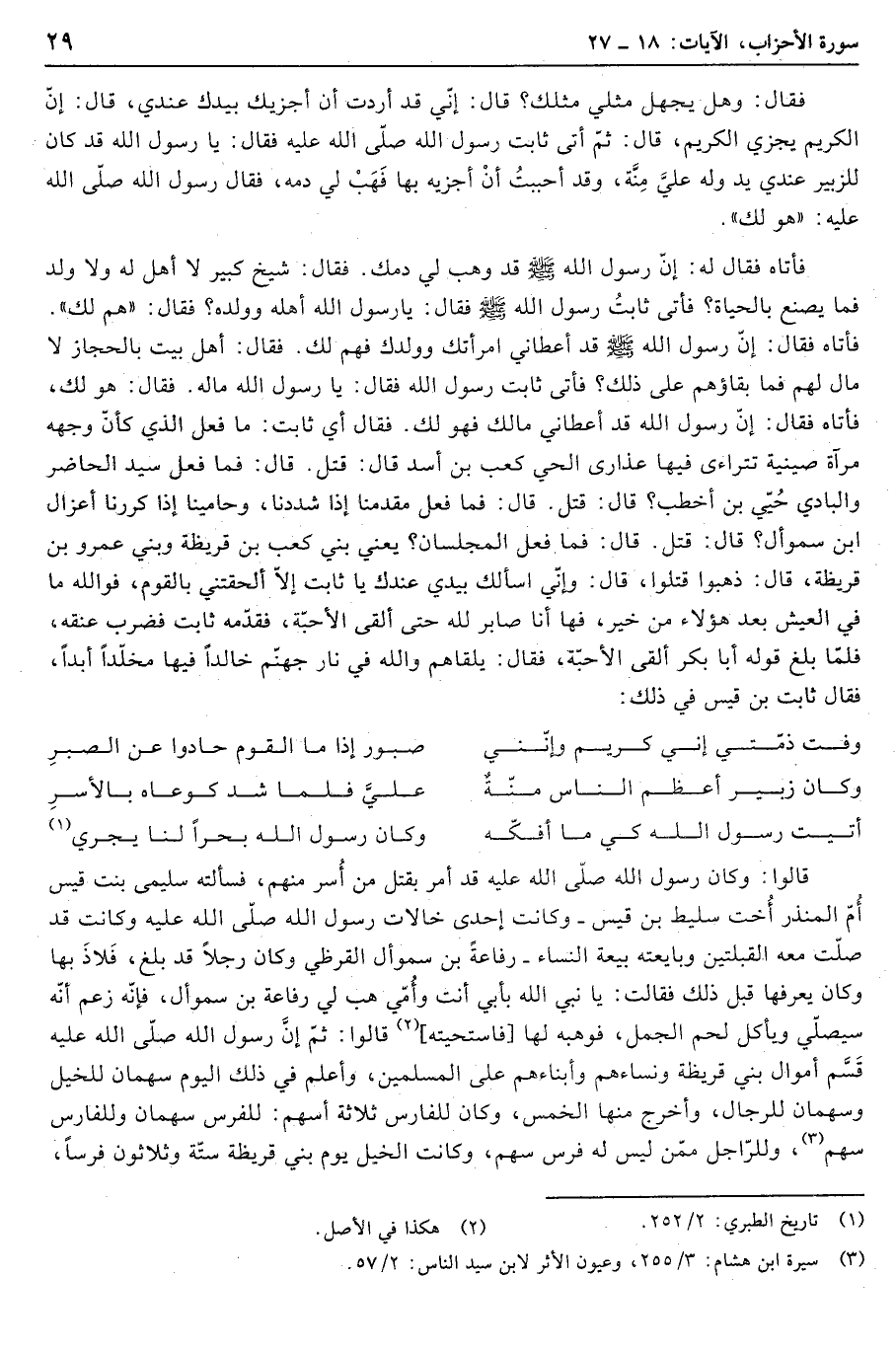 فأتاه فقال: إنّ رسول الله صلّى الله عليه وسلم قد أعطاني امرأتك وولدك فهم لك. فقال: أهل بيت بالحجاز لا مال لهم فما بقاؤهم على ذلك؟ فأتى ثابت رسول الله فقال: يا رسول الله ماله. فقال: هو لك، فأتاه فقال: إنّ رسول الله قد أعطاني مالك فهو لك. فقال أي ثابت: ما فعل الذي كأنّ وجهه مرآة صينية تتراءى فيها عذارى الحي كعب بن أسد قال: قتل. قال: فما فعل سيد الحاضر والبادي حيي بن أخطب؟ قال: قتل. قال: فما فعل مقدمنا إذا شددنا، وحامينا إذا كررنا أعزال ابن سموأل؟ قال: قتل. قال: فما فعل المجلسان؟ يعني بني كعب بن قريظة وبني عمرو بن قريظة، قال: ذهبوا قتلوا، قال: وإنّي اسألك بيدي عندك يا ثابت إلّا ألحقتني بالقوم، فو الله ما في العيش بعد هؤلاء من خير، فها أنا صابر لله حتى ألقى الأحبّة، فقدّمه ثابت فضرب عنقه، فلمّا بلغ قوله أبا بكر ألقى الأحبّة، فقال: يلقاهم والله في نار جهنّم خالدا فيها مخلّدا أبدا، فقال ثابت بن قيس في ذلك: