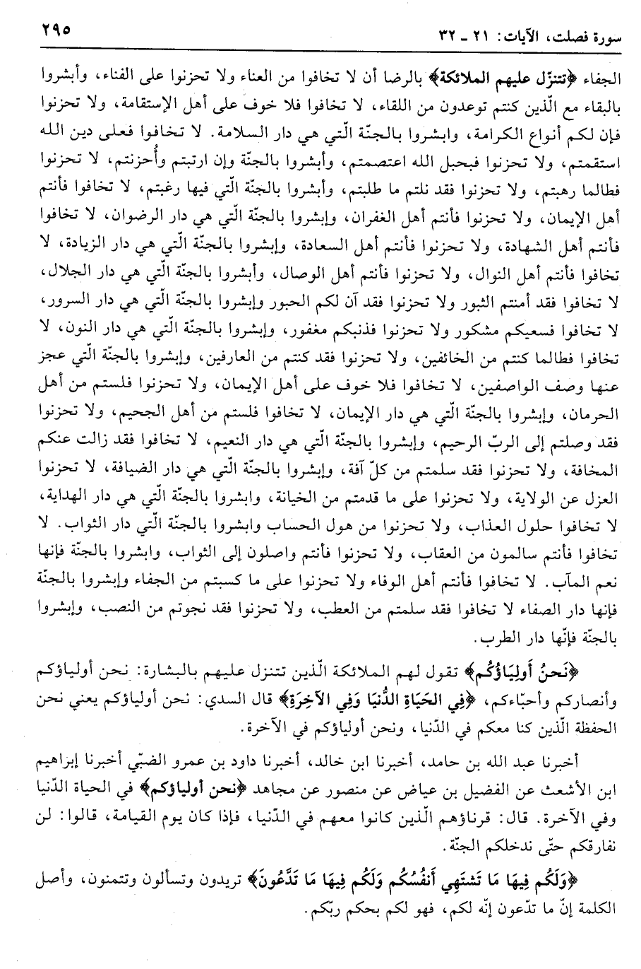 أخبرنا عبد الله بن حامد، أخبرنا ابن خالد، أخبرنا داود بن عمرو الضبّي أخبرنا إبراهيم ابن الأشعث عن الفضيل بن عياض عن منصور عن مجاهد نَحْنُ أَوْلِياؤُكُمْ فِي الْحَياةِ الدُّنْيا وَفِي الْآخِرَةِ
