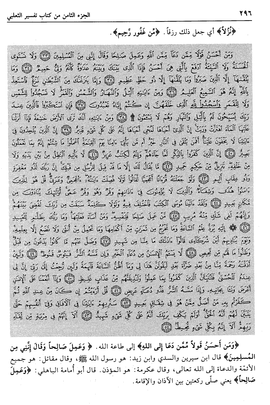 وَمَنْ أَحْسَنُ قَوْلًا مِمَّنْ دَعا إِلَى اللَّهِ إلى طاعة الله. وَعَمِلَ صالِحاً وَقالَ إِنَّنِي مِنَ الْمُسْلِمِينَ قال ابن سيرين والسدي وابن زيد: هو رسول الله صلّى الله عليه وسلم، وقال مقاتل: هو جميع الأئمّة والدعاة إلى الله تعالى، وقال عكرمة: هو المؤذن. قال أبو أمامة الباهلي: وَعَمِلَ صالِحاً يعني صلّى ركعتين بين الآذان والإقامة.