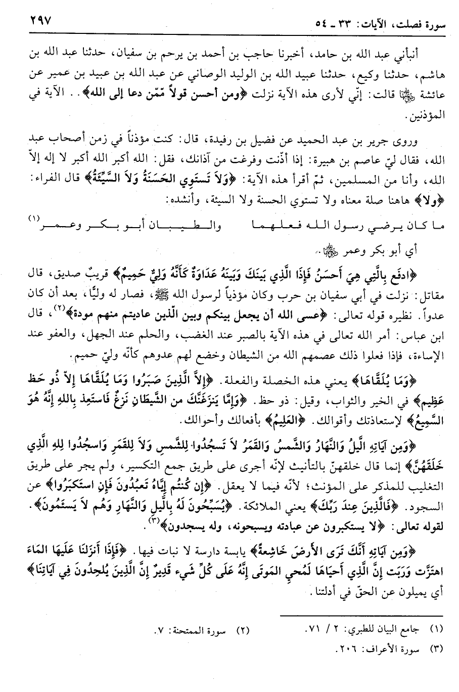 وروى جرير بن عبد الحميد عن فضيل بن رفيدة، قال: كنت مؤذنا في زمن أصحاب عبد الله، فقال لي عاصم بن هبيرة: إذا أذّنت وفرغت من آذانك، فقل: الله أكبر الله أكبر لا إله إلّا الله، وأنا من المسلمين، ثمّ أقرأ هذه الآية: وَلا تَسْتَوِي الْحَسَنَةُ وَلَا السَّيِّئَةُ قال الفراء: