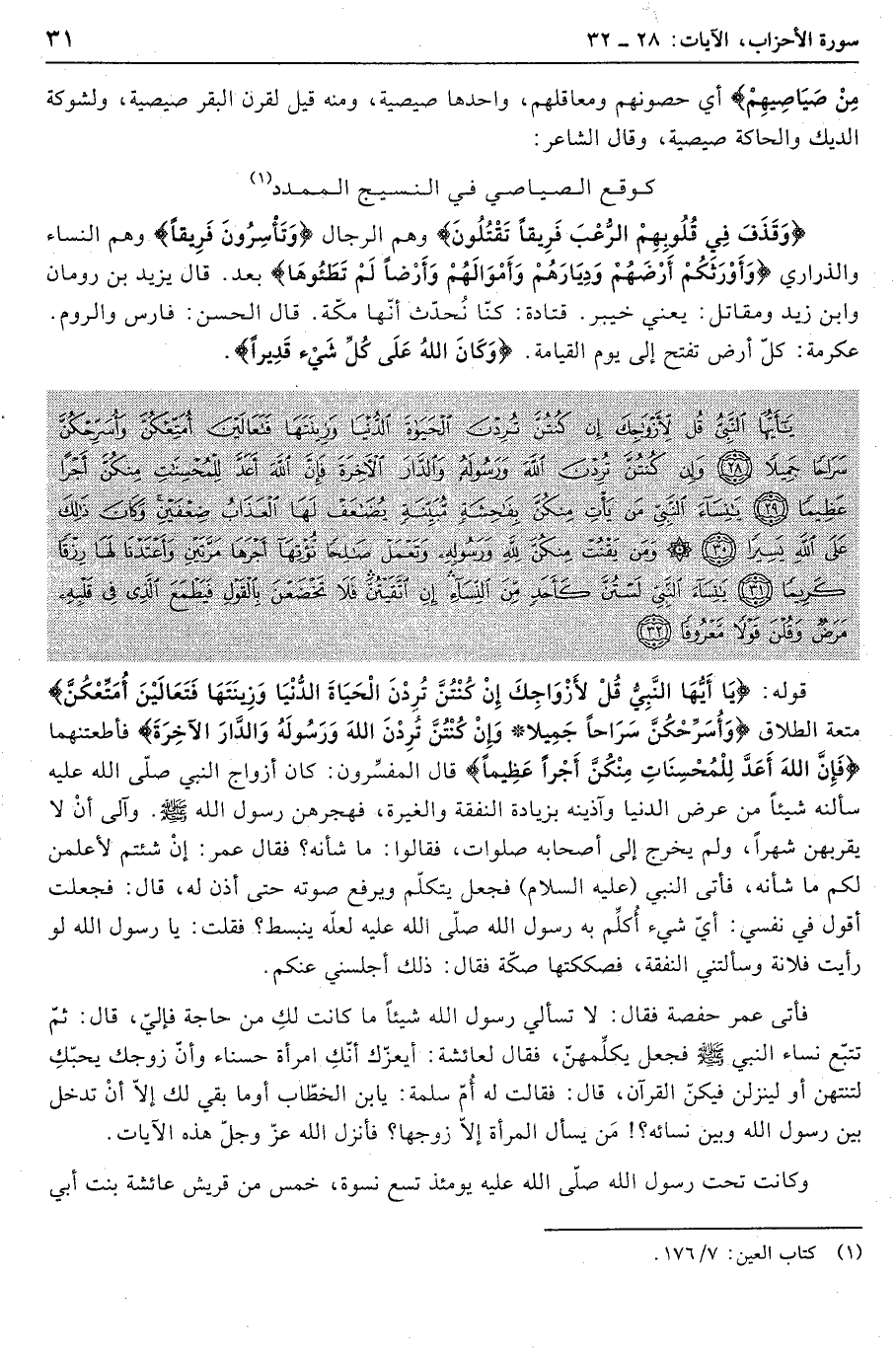 يا أَيُّهَا النَّبِيُّ قُلْ لِأَزْواجِكَ إِنْ كُنْتُنَّ تُرِدْنَ الْحَياةَ الدُّنْيا وَزِينَتَها فَتَعالَيْنَ أُمَتِّعْكُنَّ وَأُسَرِّحْكُنَّ سَراحاً جَمِيلاً (28) وَإِنْ كُنْتُنَّ تُرِدْنَ اللَّهَ وَرَسُولَهُ وَالدَّارَ الْآخِرَةَ فَإِنَّ اللَّهَ أَعَدَّ لِلْمُحْسِناتِ مِنْكُنَّ أَجْراً عَظِيماً (29) يا نِساءَ النَّبِيِّ مَنْ يَأْتِ مِنْكُنَّ بِفاحِشَةٍ مُبَيِّنَةٍ يُضاعَفْ لَهَا الْعَذابُ ضِعْفَيْنِ وَكانَ ذلِكَ عَلَى اللَّهِ يَسِيراً (30) وَمَنْ يَقْنُتْ مِنْكُنَّ لِلَّهِ وَرَسُولِهِ وَتَعْمَلْ صالِحاً نُؤْتِها أَجْرَها مَرَّتَيْنِ وَأَعْتَدْنا لَها رِزْقاً كَرِيماً (31) يا نِساءَ النَّبِيِّ لَسْتُنَّ كَأَحَدٍ مِنَ النِّساءِ إِنِ اتَّقَيْتُنَّ فَلا تَخْضَعْنَ بِالْقَوْلِ فَيَطْمَعَ الَّذِي فِي قَلْبِهِ مَرَضٌ وَقُلْنَ قَوْلاً مَعْرُوفاً (32)