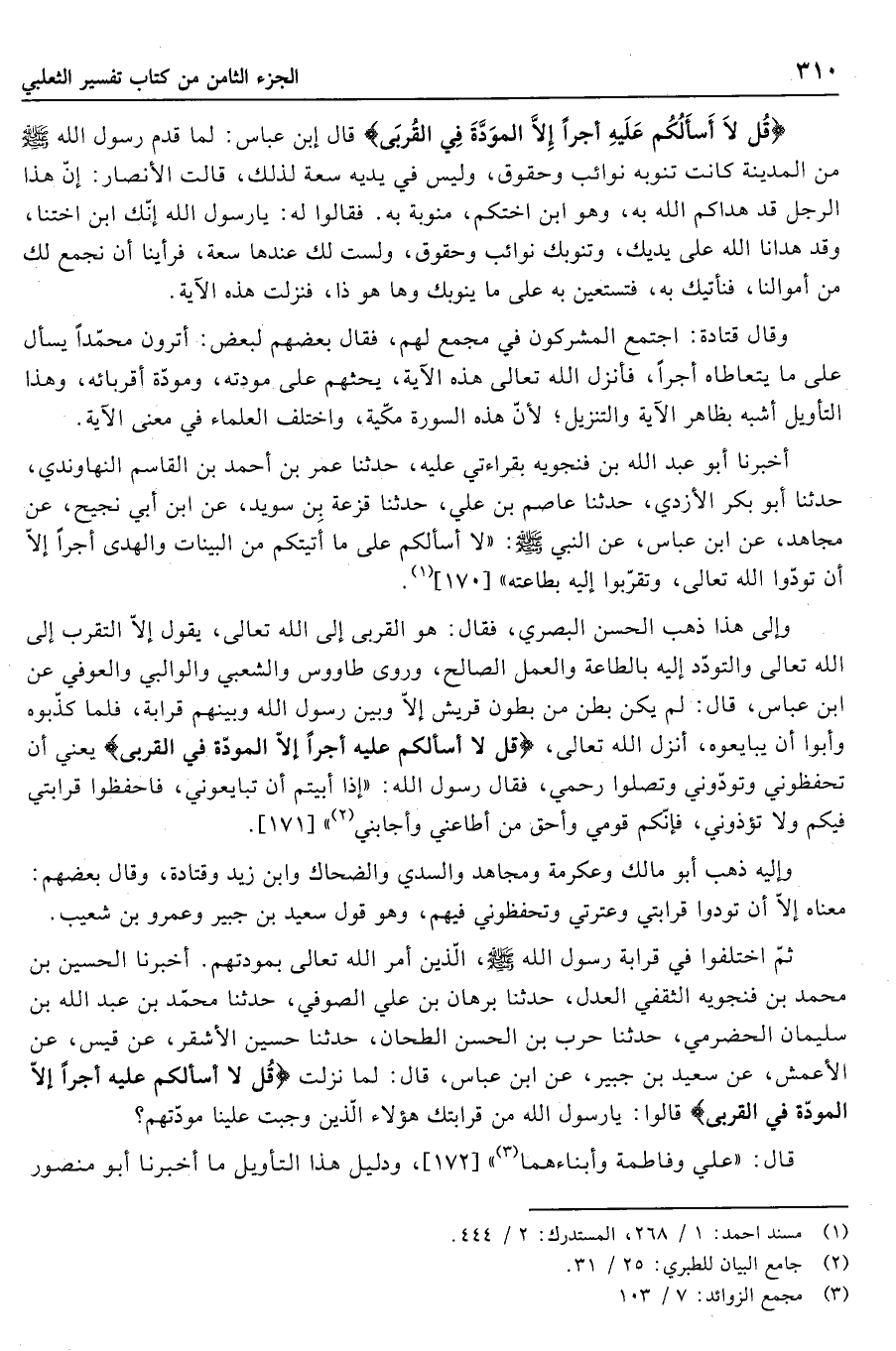 وروى طاوس والشعبي والوالبي والعوفي عن ابن عباس، قال: لم يكن بطن من بطون قريش إلّا وبين رسول الله وبينهم قرابة، فلما كذّبوه وأبوا أن يبايعوه، أنزل الله تعالى، قُلْ لا أَسْئَلُكُمْ عَلَيْهِ أَجْراً إِلَّا الْمَوَدَّةَ فِي الْقُرْبى يعني أن تحفظوني وتودّوني وتصلوا رحمي، فقال رسول الله: «إذا أبيتم أن تبايعوني، فاحفظوا قرابتي فيكم ولا تؤذوني، فإنّكم قومي وأحق من أطاعني وأجابني «2» » [171] .