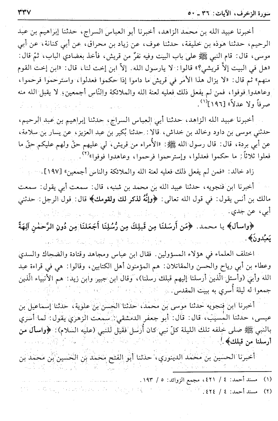 أخبرنا ابن فنجويه حدثنا موسى بن محمد، حدثنا الحسن بن علوية، حدثنا إسماعيل بن عيسى، حدثنا المسيب، قال: قال: أبو جعفر الدمشقي: سمعت الزهري يقول: لما أسري بالنبي صلّى الله عليه وسلم صلّى خلفه تلك الليلة كلّ نبي كان أرسل فقيل للنبي (عليه السلام) : وَسْئَلْ مَنْ أَرْسَلْنا مِنْ قَبْلِكَ.