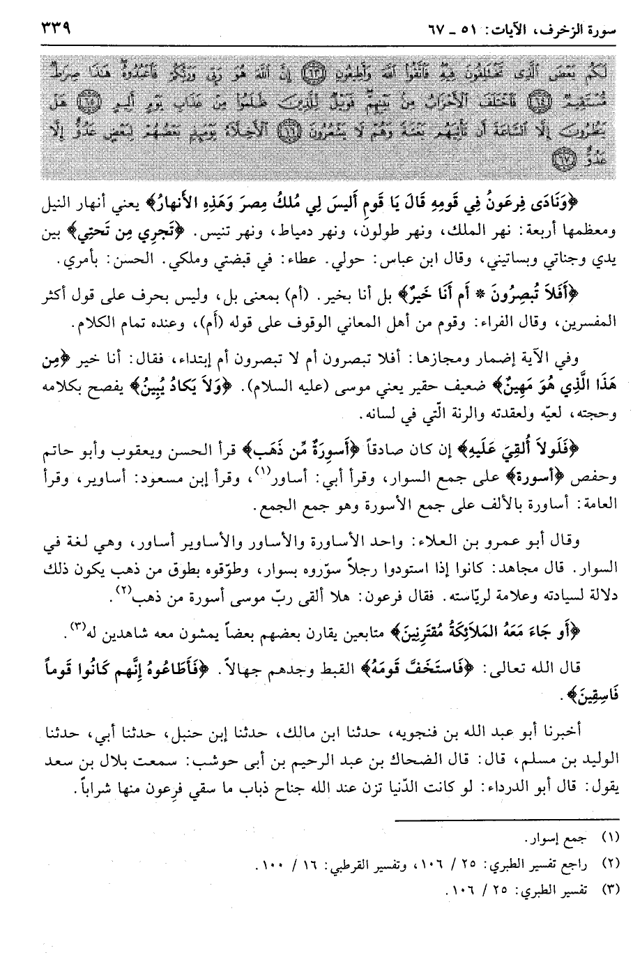وَنادى فِرْعَوْنُ فِي قَوْمِهِ قالَ يا قَوْمِ أَلَيْسَ لِي مُلْكُ مِصْرَ وَهذِهِ الْأَنْهارُ تَجْرِي مِنْ تَحْتِي أَفَلا تُبْصِرُونَ (51) أَمْ أَنَا خَيْرٌ مِنْ هذَا الَّذِي هُوَ مَهِينٌ وَلا يَكادُ يُبِينُ (52) فَلَوْلا أُلْقِيَ عَلَيْهِ أَسْوِرَةٌ مِنْ ذَهَبٍ أَوْ جاءَ مَعَهُ الْمَلائِكَةُ مُقْتَرِنِينَ (53) فَاسْتَخَفَّ قَوْمَهُ فَأَطاعُوهُ إِنَّهُمْ كانُوا قَوْماً فاسِقِينَ (54) فَلَمَّا آسَفُونا انْتَقَمْنا مِنْهُمْ فَأَغْرَقْناهُمْ أَجْمَعِينَ (55)