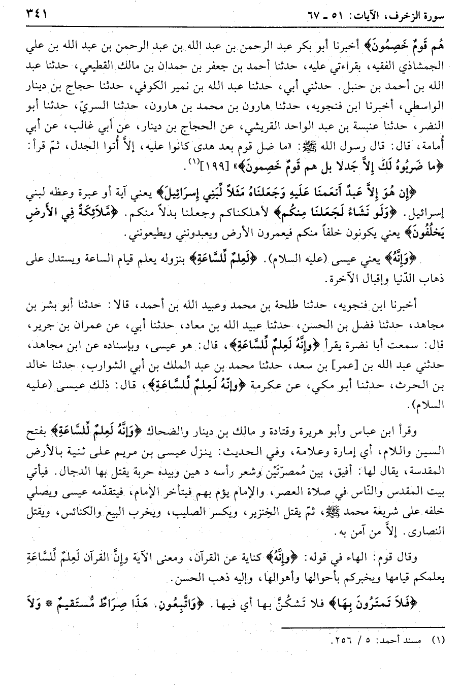أخبرنا ابن فنجويه، حدثنا طلحة بن محمد وعبيد الله بن أحمد، قالا: حدثنا أبو بشر بن مجاهد، حدثنا فضل بن الحسن، حدثنا عبيد الله بن معاد، حدثنا أبي، عن عمران بن جرير، قال: سمعت أبا نضرة يقرأ وَإِنَّهُ لَعِلْمٌ لِلسَّاعَةِ، قال: هو عيسى، وبإسناده عن ابن مجاهد، حدثني عبد الله بن [عمر] بن سعد، حدثنا محمد بن عبد الملك بن أبي الشوارب، حدثنا خالد بن الحرث، حدثنا أبو مكي، عن عكرمة وَإِنَّهُ لَعِلْمٌ لِلسَّاعَةِ، قال: ذلك عيسى (عليه السلام) .