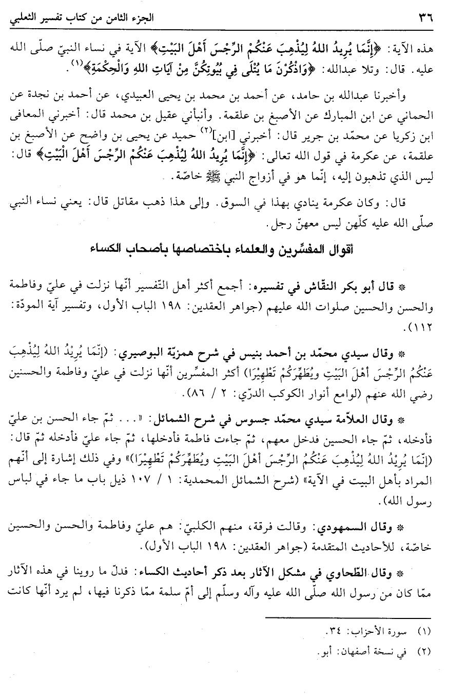 (3) (أقوال المفسّرين والعلماء باختصاصها بأصحاب الكساء) قال أبو بكر النقّاش في تفسيره: أجمع أكثر أهل التّفسير أنّها نزلت في عليّ وفاطمة والحسن والحسين صلوات الله عليهم (جواهر العقدين: 198 الباب الأول، وتفسير آية المودّة: