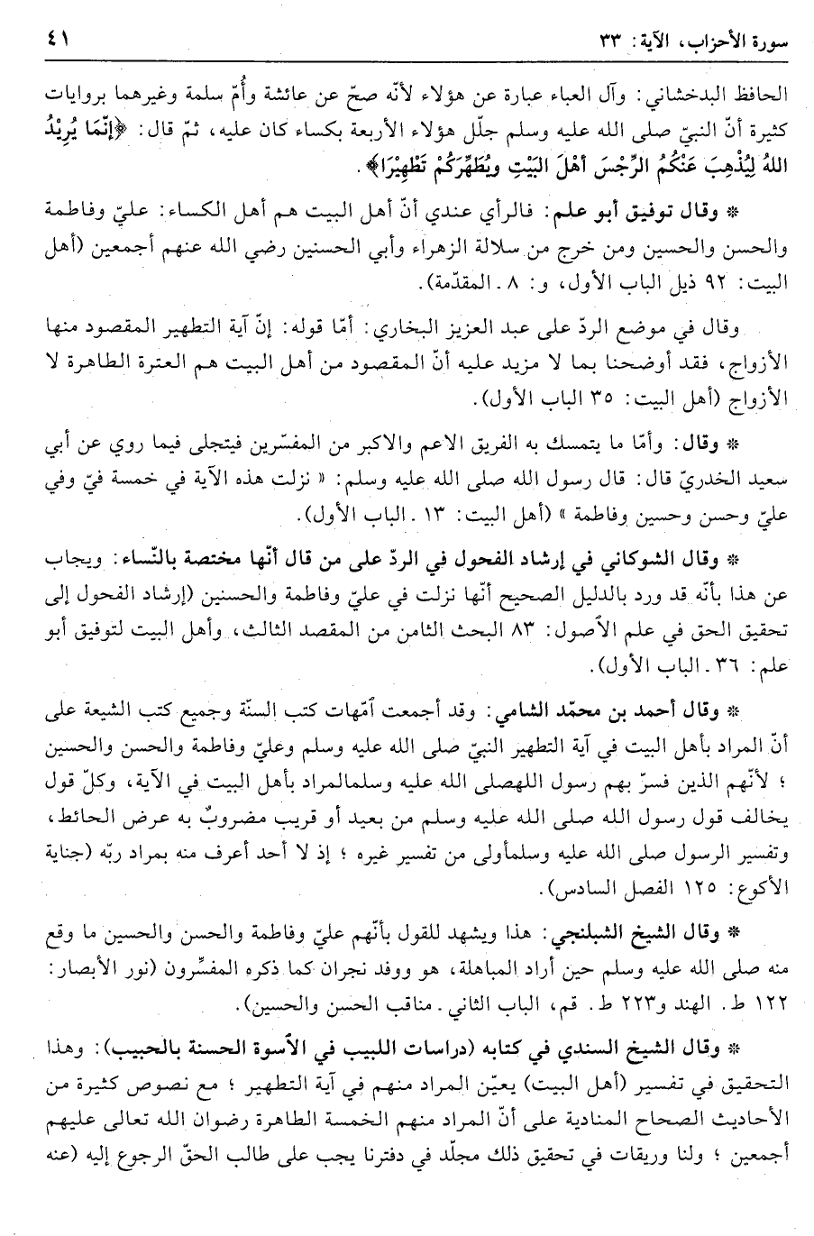 وقال في موضع الردّ على عبد العزيز البخاري: أمّا قوله: إنّ آية التطهير المقصود منها الأزواج، فقد أوضحنا بما لا مزيد عليه أنّ المقصود من أهل البيت هم العترة الطاهرة لا الأزواج (أهل البيت: 35 الباب الأول) .