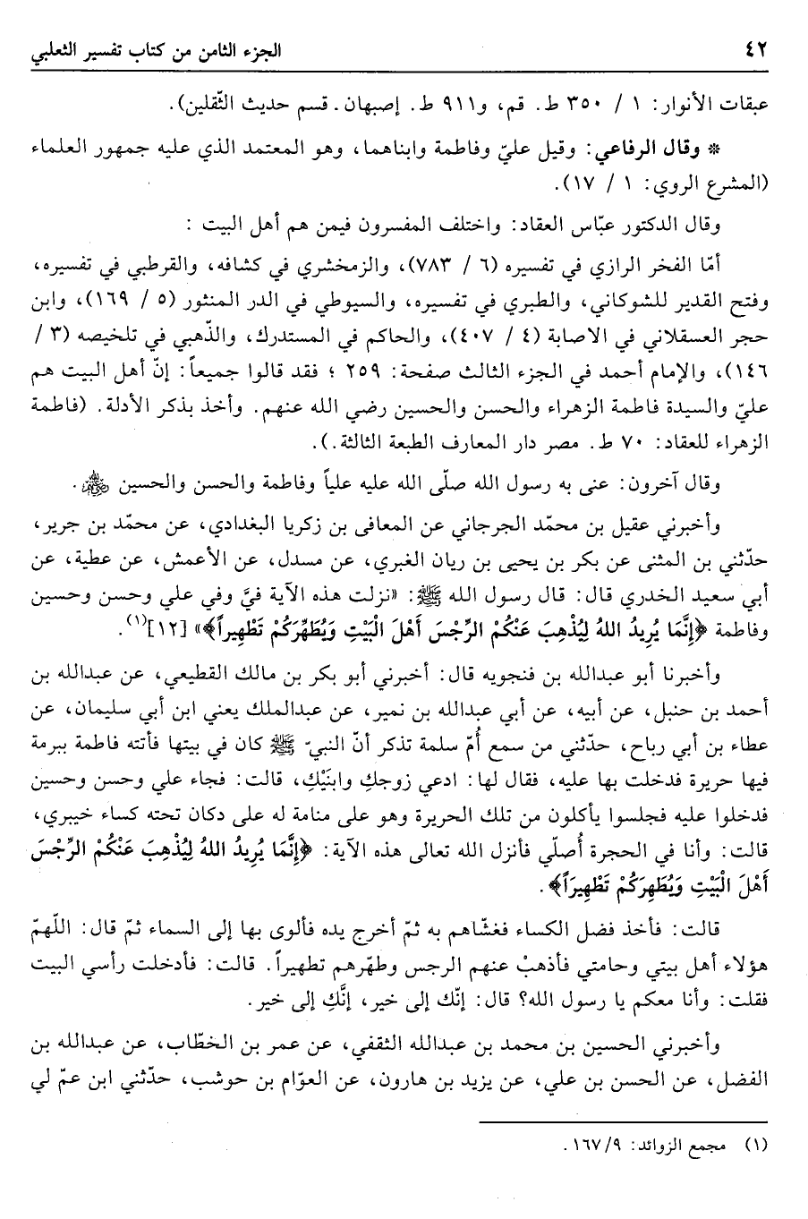 أمّا الفخر الرازي في تفسيره (6/ 783) ، والزمخشري في كشافه، والقرطبي في تفسيره، وفتح القدير للشوكاني، والطبري في تفسيره، والسيوطي في الدر المنثور (5/ 169) ، وابن حجر العسقلاني في الإصابة (4/ 407) ، والحاكم في المستدرك، والذّهبي في تلخيصه (3/ 146) ، والإمام أحمد في الجزء الثالث صفحة: 259 فقد قالوا جميعا: إنّ أهل البيت هم عليّ والسيدة فاطمة الزهراء والحسن والحسين رضي الله عنهم. وأخذ بذكر الأدلة. (فاطمة الزهراء للعقاد: 70 ط. مصر دار المعارف الطبعة الثالثة.) . [.....]