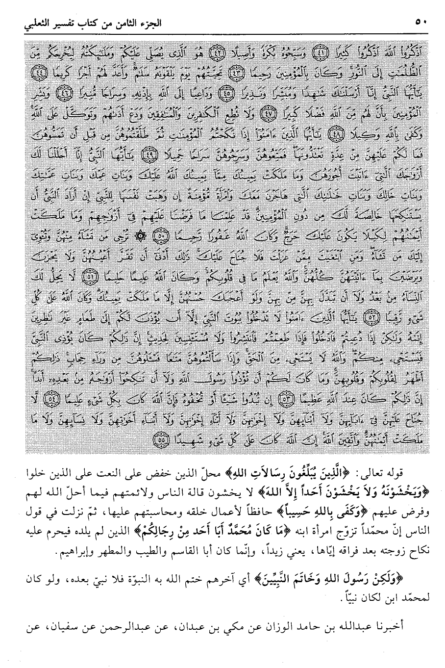 الَّذِينَ يُبَلِّغُونَ رِسالاتِ اللَّهِ وَيَخْشَوْنَهُ وَلا يَخْشَوْنَ أَحَداً إِلاَّ اللَّهَ وَكَفى بِاللَّهِ حَسِيباً (39) ما كانَ مُحَمَّدٌ أَبا أَحَدٍ مِنْ رِجالِكُمْ وَلكِنْ رَسُولَ اللَّهِ وَخاتَمَ النَّبِيِّينَ وَكانَ اللَّهُ بِكُلِّ شَيْءٍ عَلِيماً (40) يا أَيُّهَا الَّذِينَ آمَنُوا اذْكُرُوا اللَّهَ ذِكْراً كَثِيراً (41) وَسَبِّحُوهُ بُكْرَةً وَأَصِيلاً (42) هُوَ الَّذِي يُصَلِّي عَلَيْكُمْ وَمَلائِكَتُهُ لِيُخْرِجَكُمْ مِنَ الظُّلُماتِ إِلَى النُّورِ وَكانَ بِالْمُؤْمِنِينَ رَحِيماً (43)