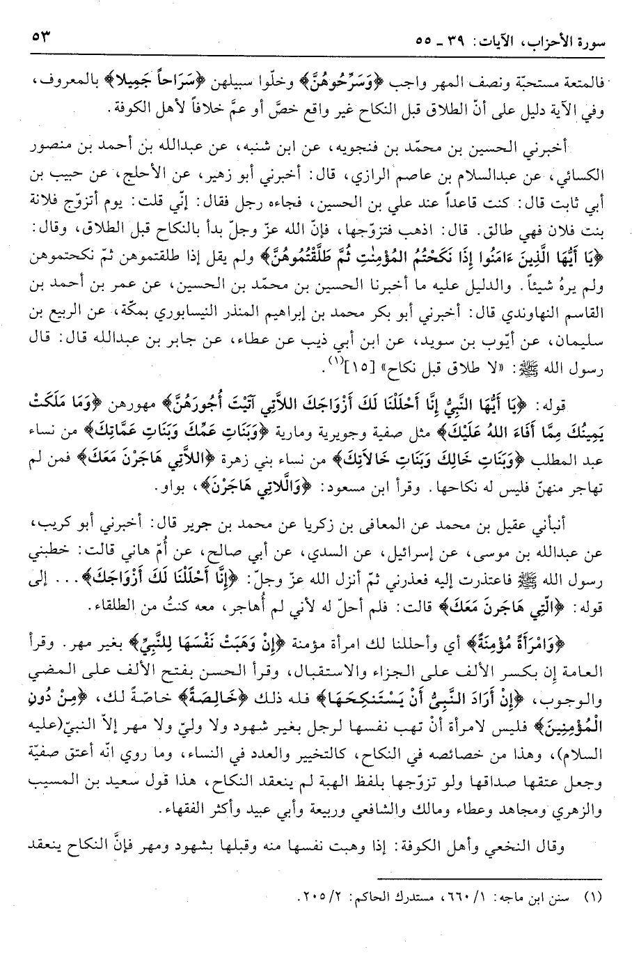 أنبأني عقيل بن محمد عن المعافى بن زكريا عن محمد بن جرير قال: أخبرني أبو كريب، عن عبد الله بن موسى، عن إسرائيل، عن السدي، عن أبي صالح، عن أمّ هاني قالت: خطبني رسول الله صلّى الله عليه وسلم فاعتذرت إليه فعذرني ثمّ أنزل الله عزّ وجلّ: إِنَّا أَحْلَلْنا لَكَ أَزْواجَكَ ... إلى قوله: اللَّاتِي هاجَرْنَ مَعَكَ قالت: فلم أحلّ له لأني لم أهاجر معه كنت من الطلقاء.