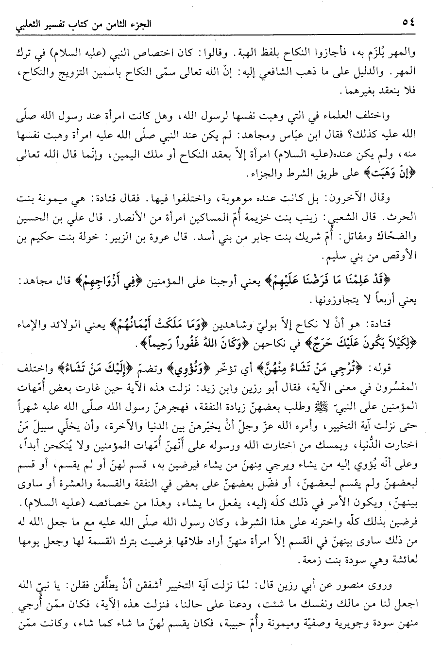 فقال أبو رزين وابن زيد: نزلت هذه الآية حين غارت بعض أمّهات المؤمنين على النبيّ صلّى الله عليه وسلم وطلب بعضهنّ زيادة النفقة، فهجرهنّ رسول الله صلّى الله عليه شهرا حتى نزلت آية التخيير، وأمره الله عزّ وجلّ أن يخيّرهنّ بين الدنيا والآخرة، وأن يخلّي سبيل من اختارت الدّنيا، ويمسك من اختارت الله ورسوله على أنّهنّ أمّهات المؤمنين ولا ينكحن أبدا، وعلى أنّه يؤوي إليه من يشاء ويرجي منهنّ من يشاء فيرضين به، قسم لهنّ أو لم يقسم، أو قسم لبعضهنّ ولم يقسم لبعضهنّ، أو فضّل بعضهنّ على بعض في النفقة والقسمة والعشرة أو ساوى بينهنّ، ويكون الأمر في ذلك كلّه إليه، يفعل ما يشاء، وهذا من خصائصه (عليه السلام) .