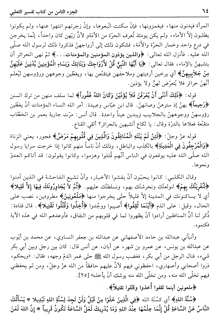 المرأة فيدنون منها، فيغمزونها، فإن سكتت اتّبعوها، وإن زجرتهم انتهوا عنها، ولم يكونوا يطلبون إلّا الإماء، ولم يكن يومئذ تعرف الحرّة من الأمة ولأنّ زيّهن كان واحدا، إنّما يخرجن في درع واحد وخمار الحرّة والأمة، فشكون ذلك إلى أزواجهنّ فذكروا ذلك لرسول الله صلّى الله عليه. فأنزل الله تعالى: وَالَّذِينَ يُؤْذُونَ الْمُؤْمِنِينَ وَالْمُؤْمِناتِ ... ثمّ نهى الحرائر أن يتشبهنّ بالإماء، فقال تعالى: يا أَيُّهَا النَّبِيُّ قُلْ لِأَزْواجِكَ وَبَناتِكَ وَنِساءِ الْمُؤْمِنِينَ يُدْنِينَ عَلَيْهِنَّ مِنْ جَلَابِيبِهِنَّ أي يرخين أرديتهن وملاحفهن فيتقنّعن بها، ويغطّين وجوههن ورؤوسهن ليعلم أنّهنّ حرائر فلا يتعرّض لهنّ ولا يؤذين.